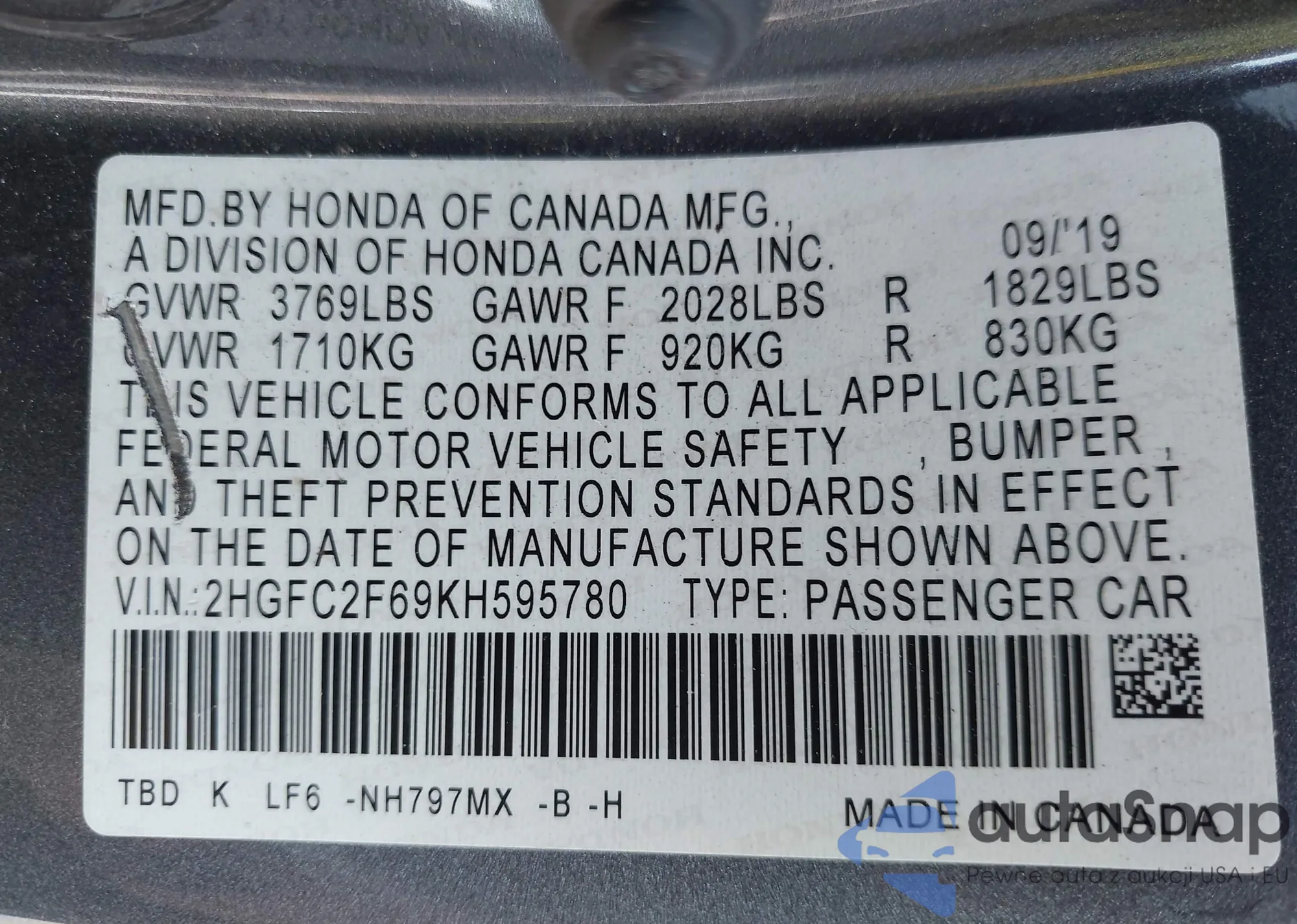 • VIN 2HGFC2F69KH595780