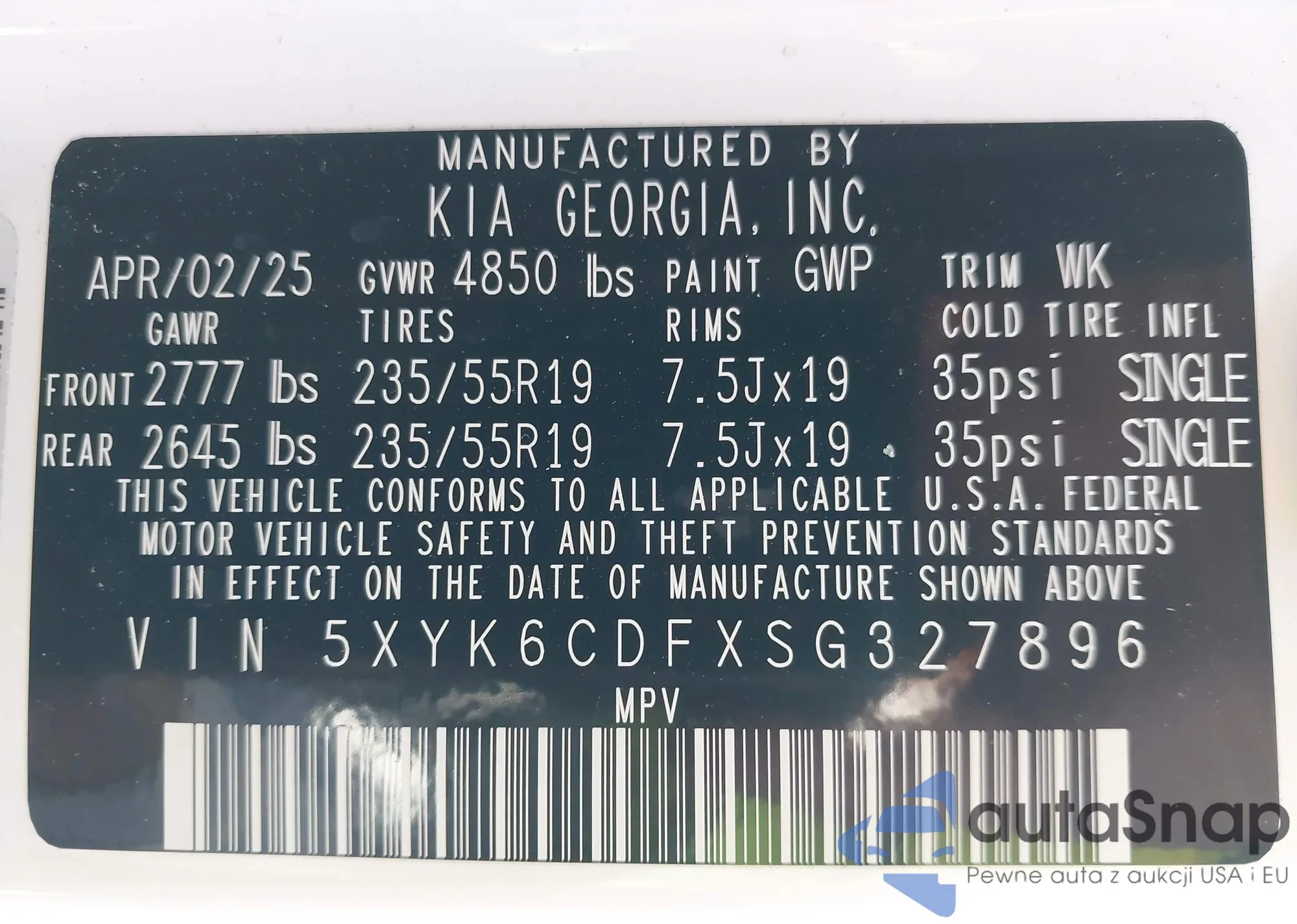 • VIN 5XYK6CDFXSG327896