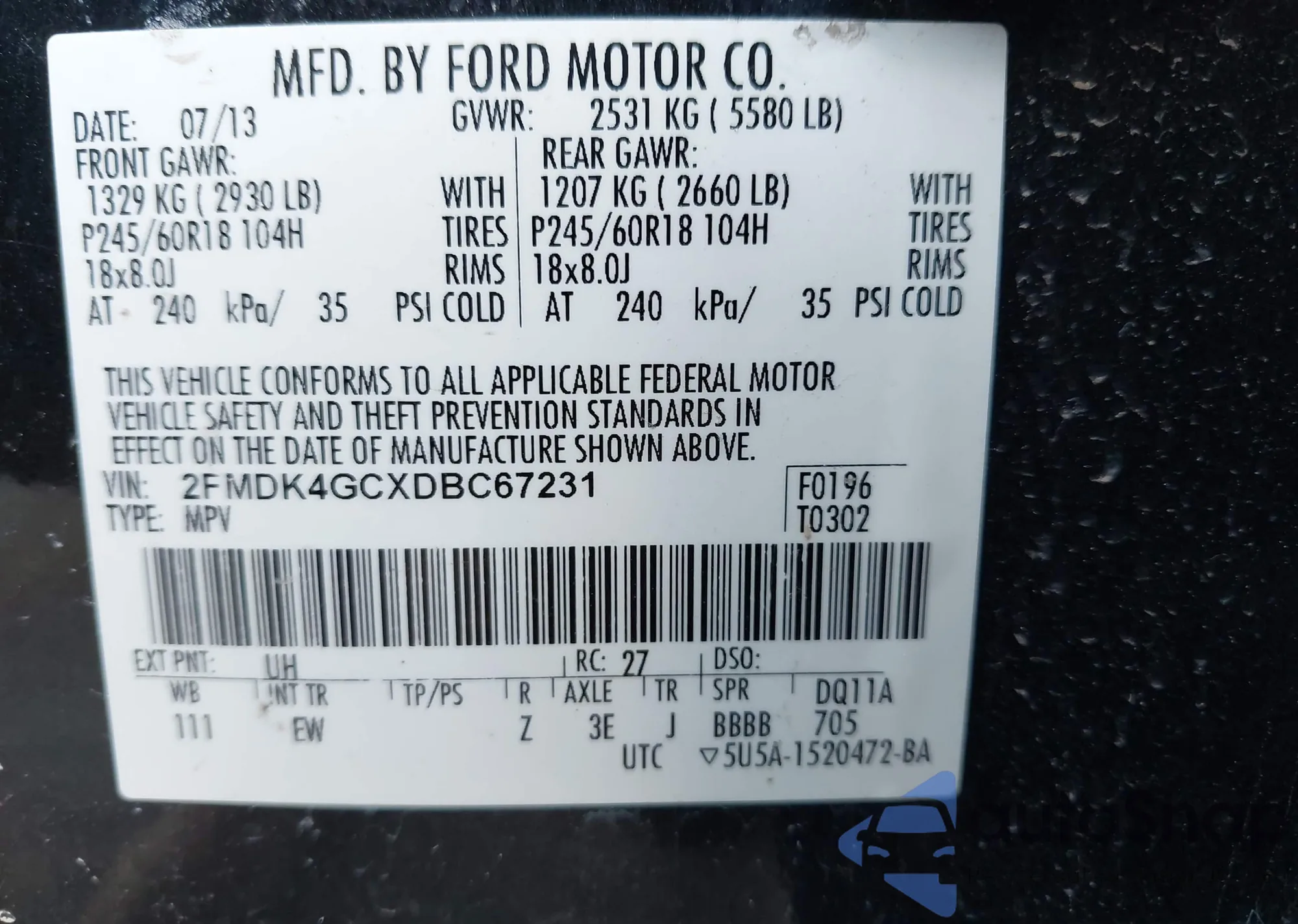• VIN 2FMDK4GCXDBC67231