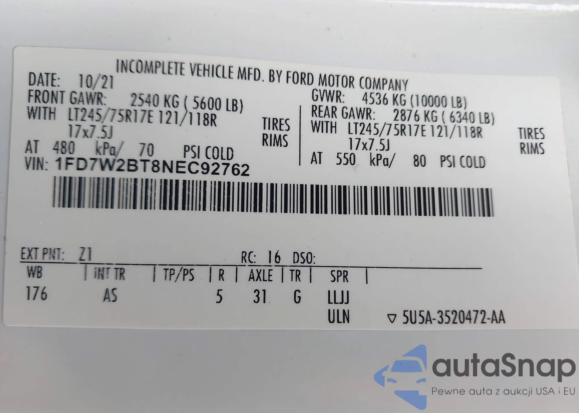 • VIN 1FD7W2BT8NEC92762
