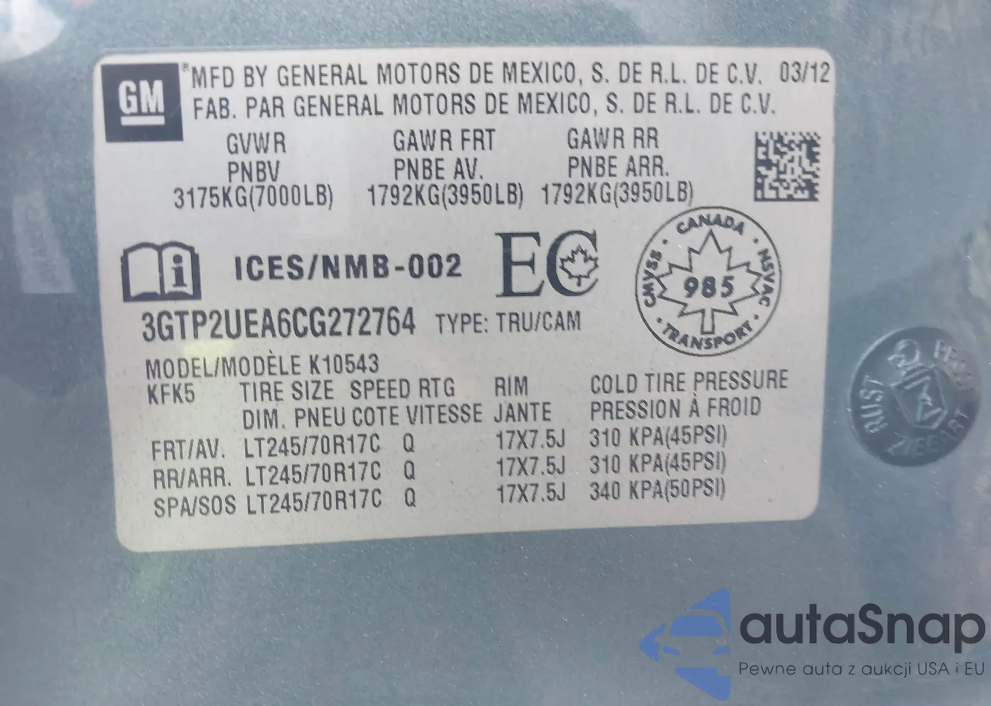 LOT: 43787575 VIN: 3GTP2UEA6CG272764