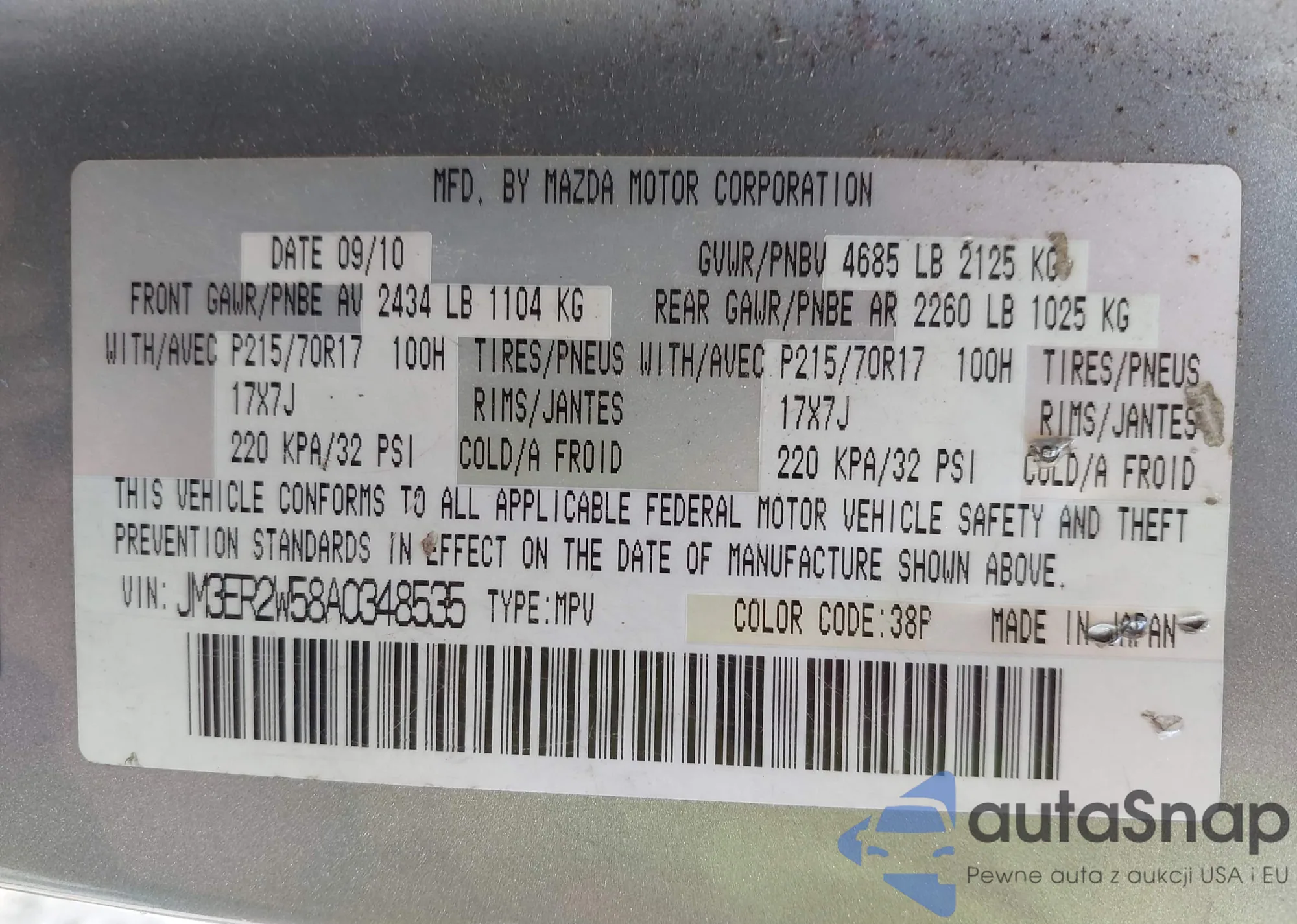 LOT: 43674054 VIN: JM3ER2W58A0348535