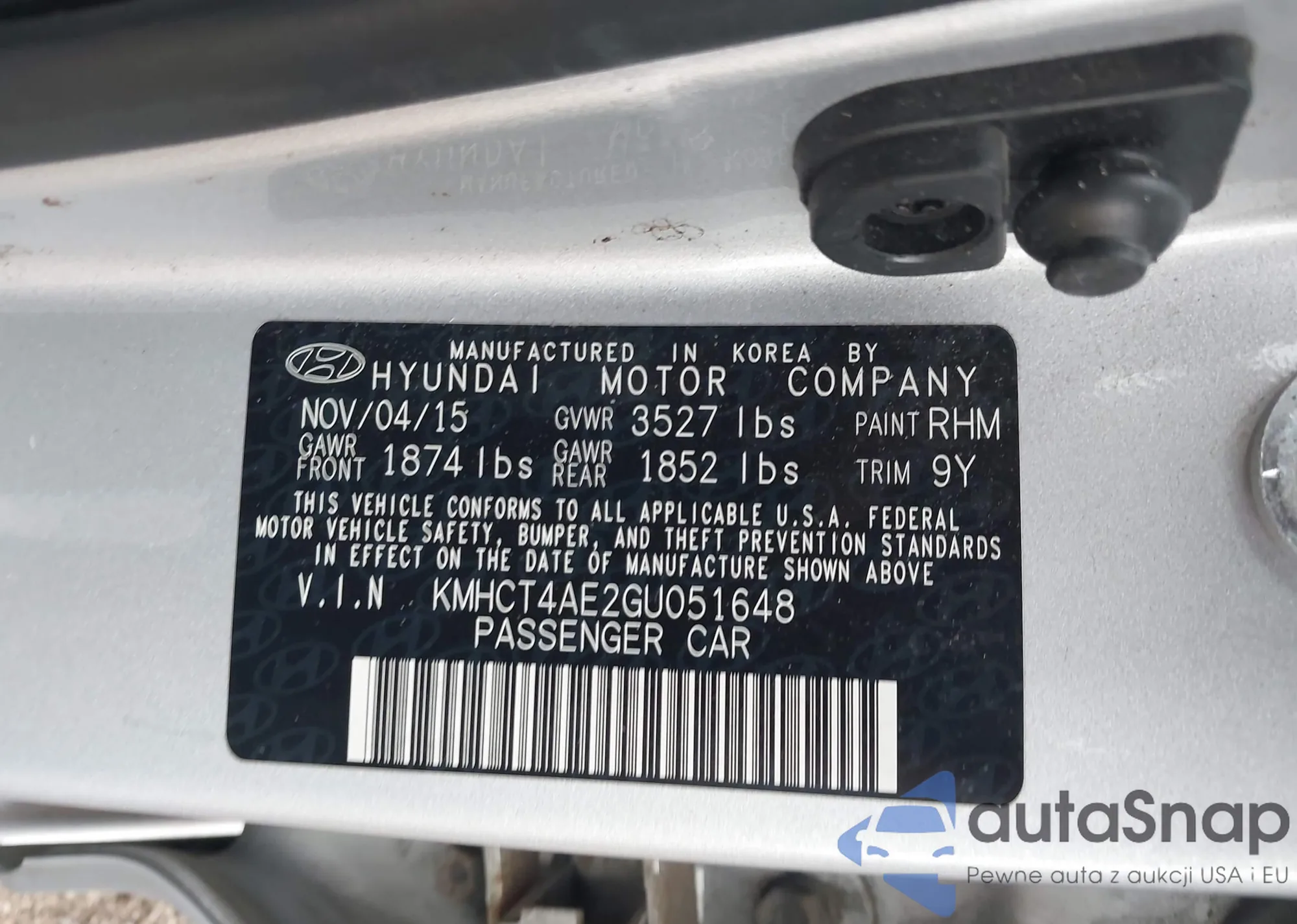 LOT: 43702908 VIN: KMHCT4AE2GU051648