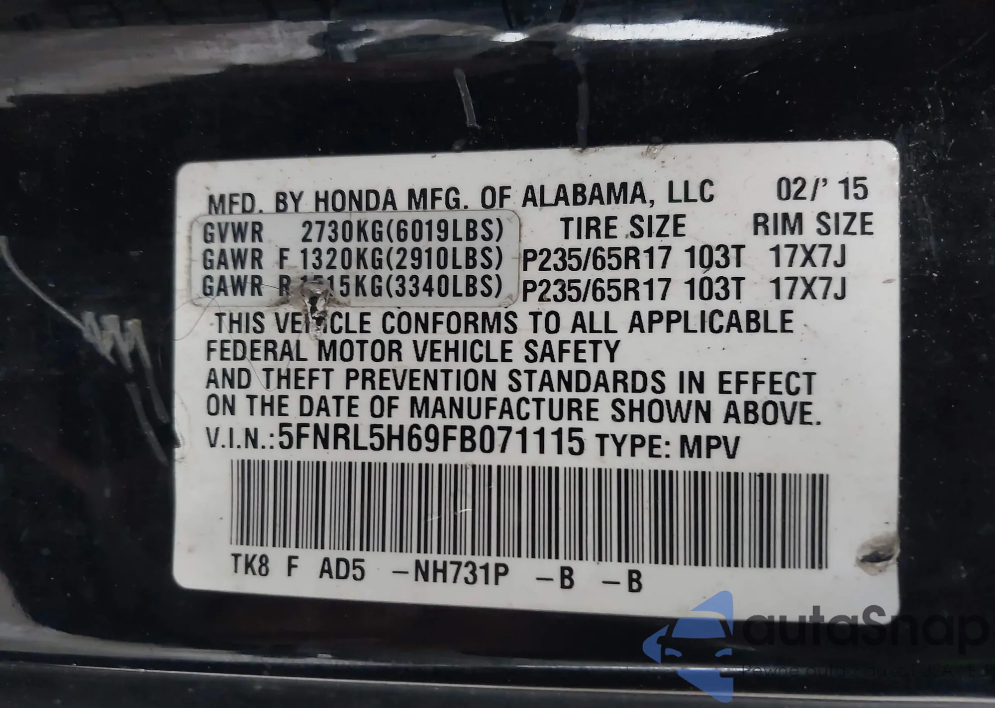 • VIN 5FNRL5H69FB071115