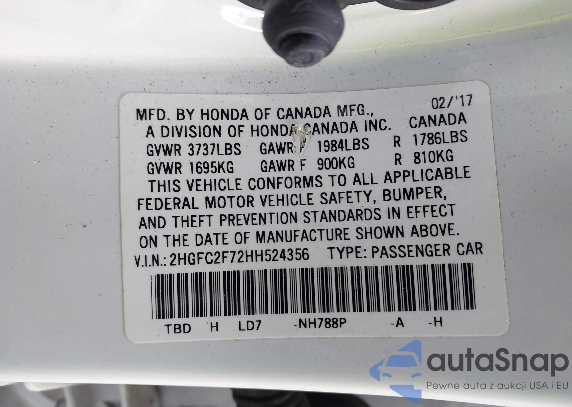 LOT: 43765707 VIN: 2HGFC2F72HH524356