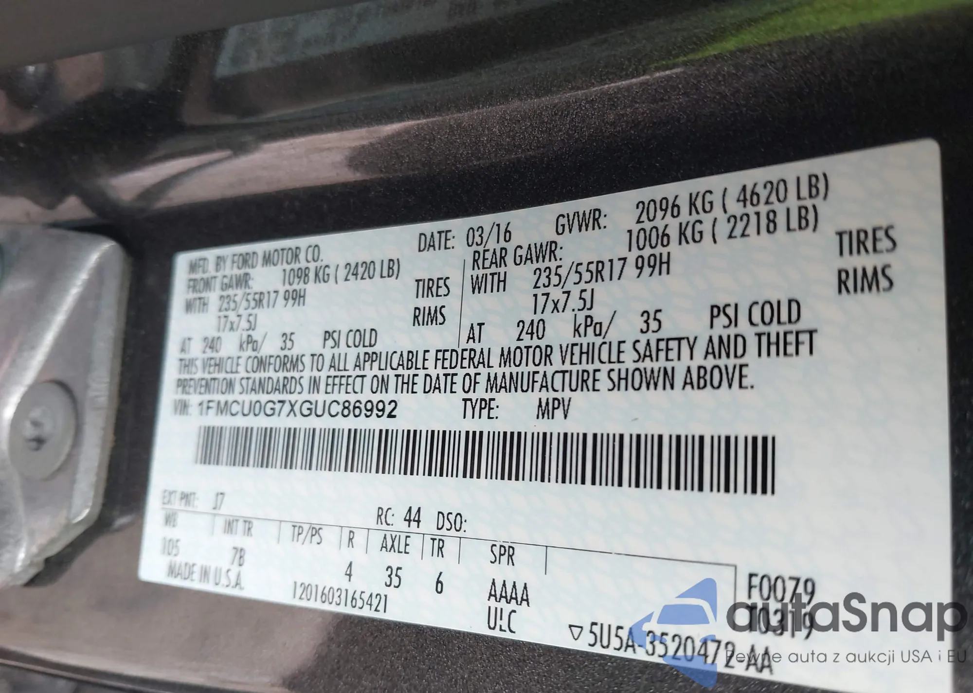 LOT: 43837401 VIN: 1FMCU0G7XGUC86992