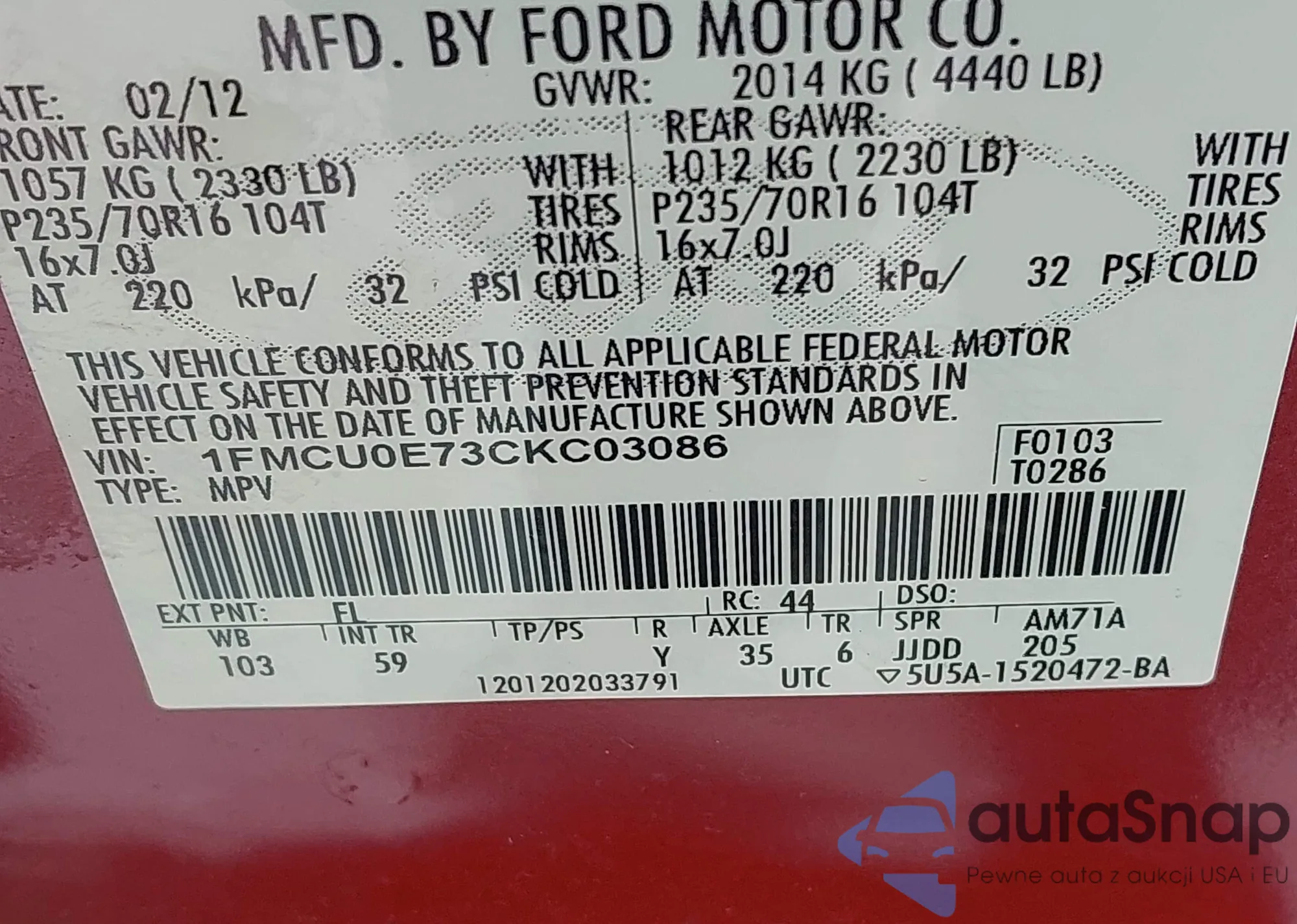 LOT: 43819857 VIN: 1FMCU0E73CKC03086