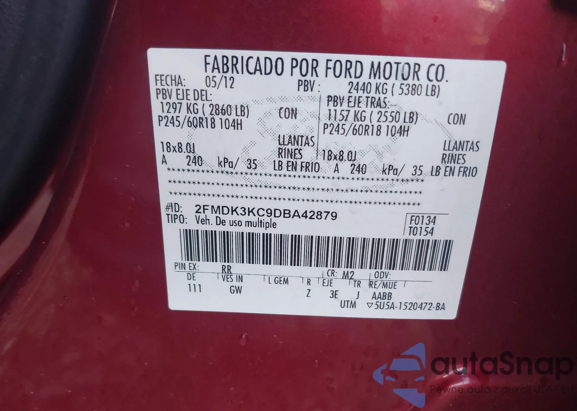 LOT: 43897694 VIN: 2FMDK3KC9DBA42879