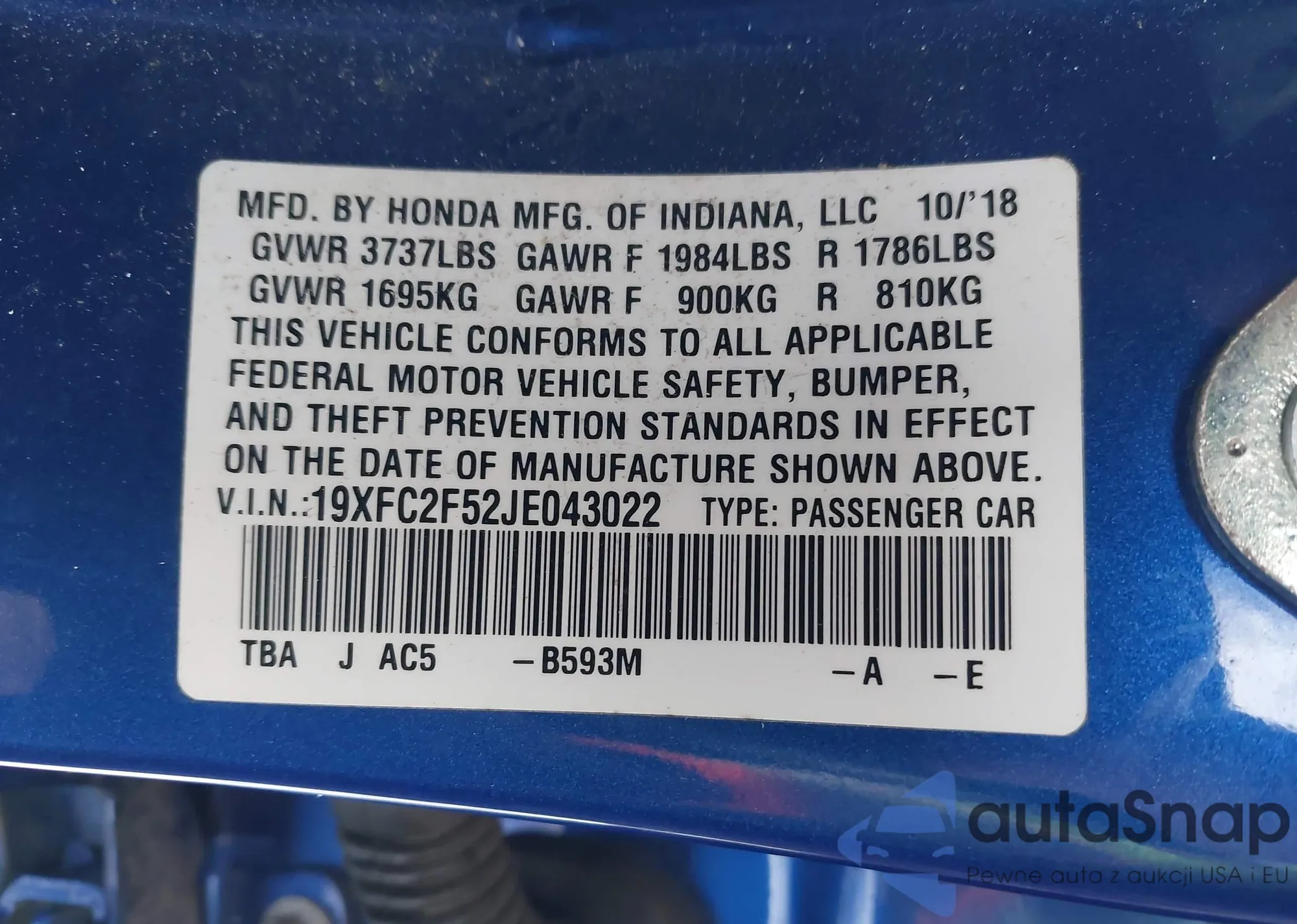 LOT: 43777483 VIN: 19XFC2F52JE043022