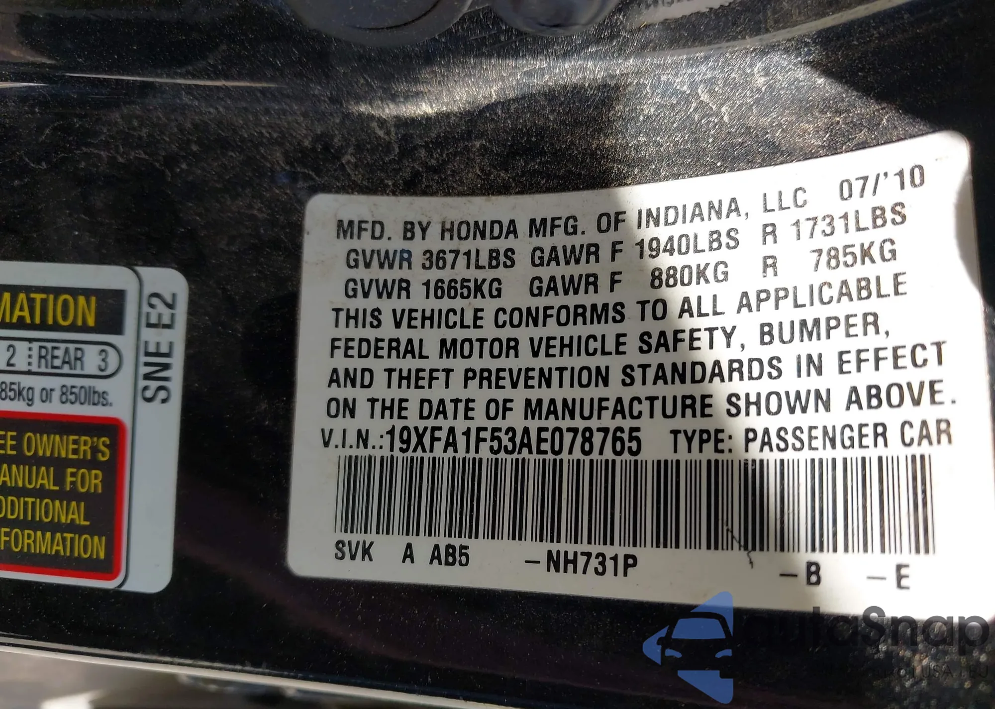 • VIN 19XFA1F53AE078765