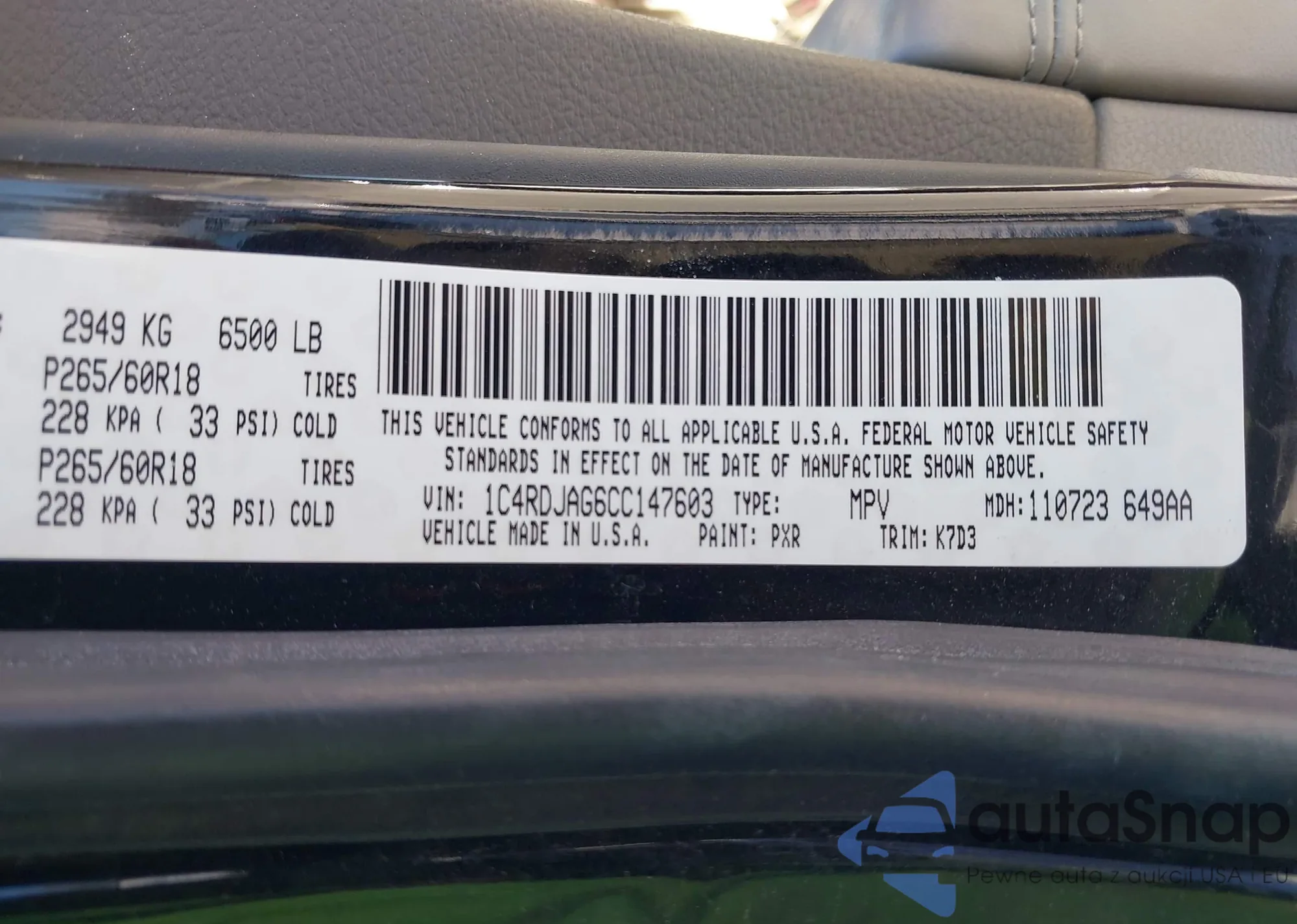• VIN 1C4RDJAG6CC147603