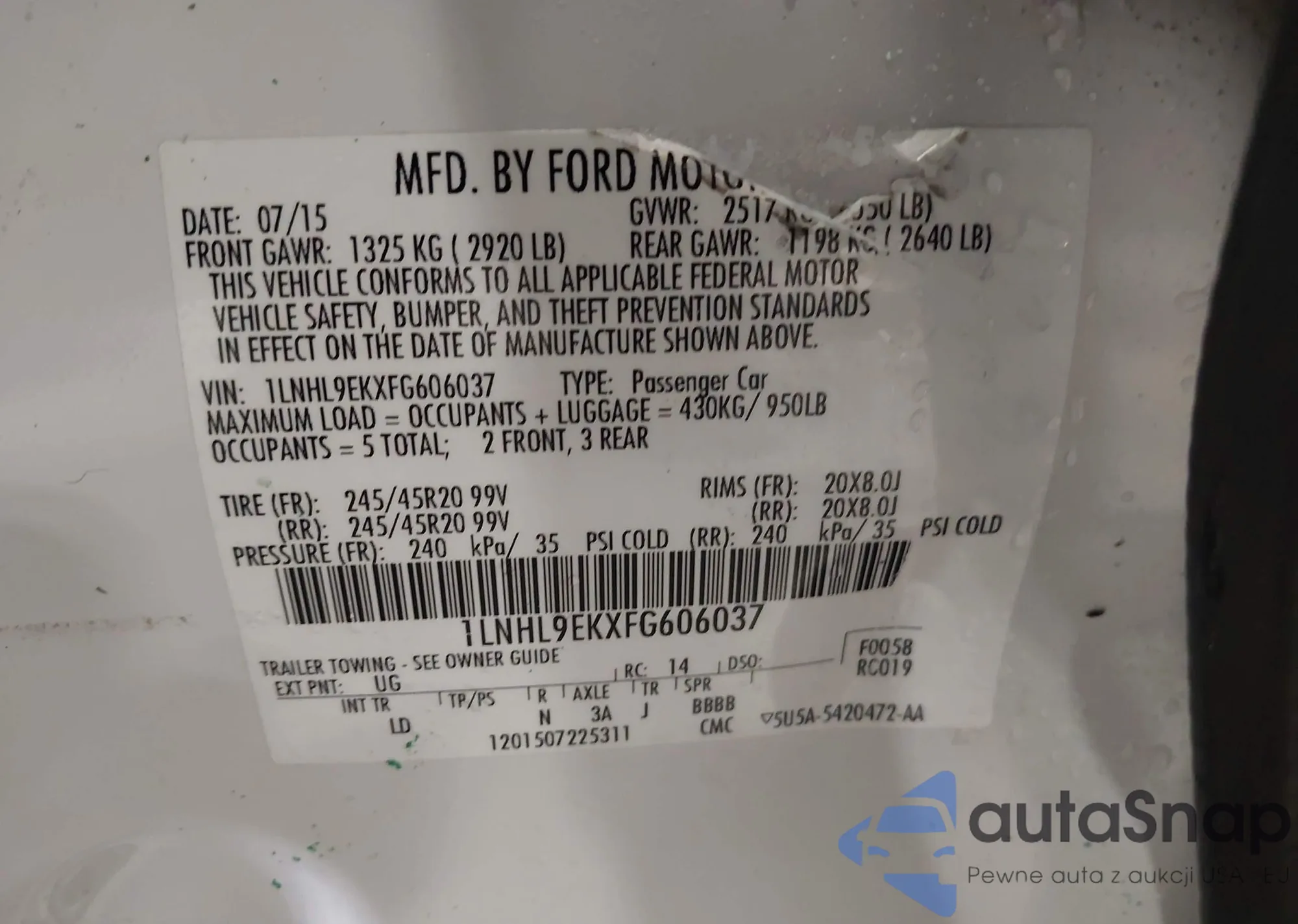 LOT: 43856279 VIN: 1LNHL9EKXFG606037