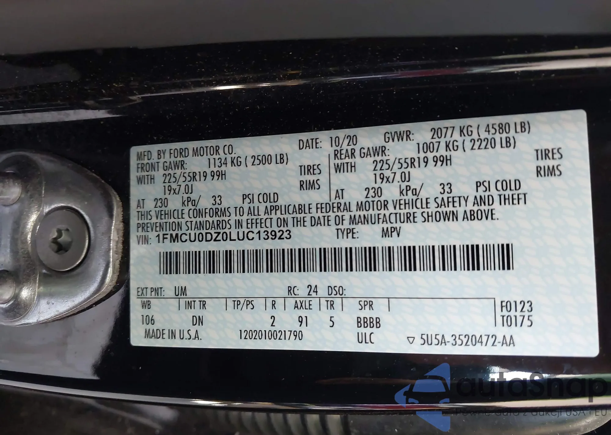 LOT: 43889208 VIN: 1FMCU0DZ0LUC13923