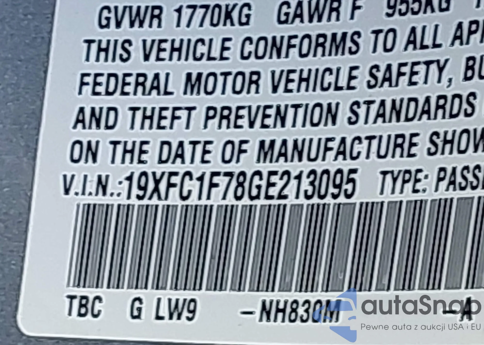 LOT: 43954595 VIN: 19XFC1F78GE213095