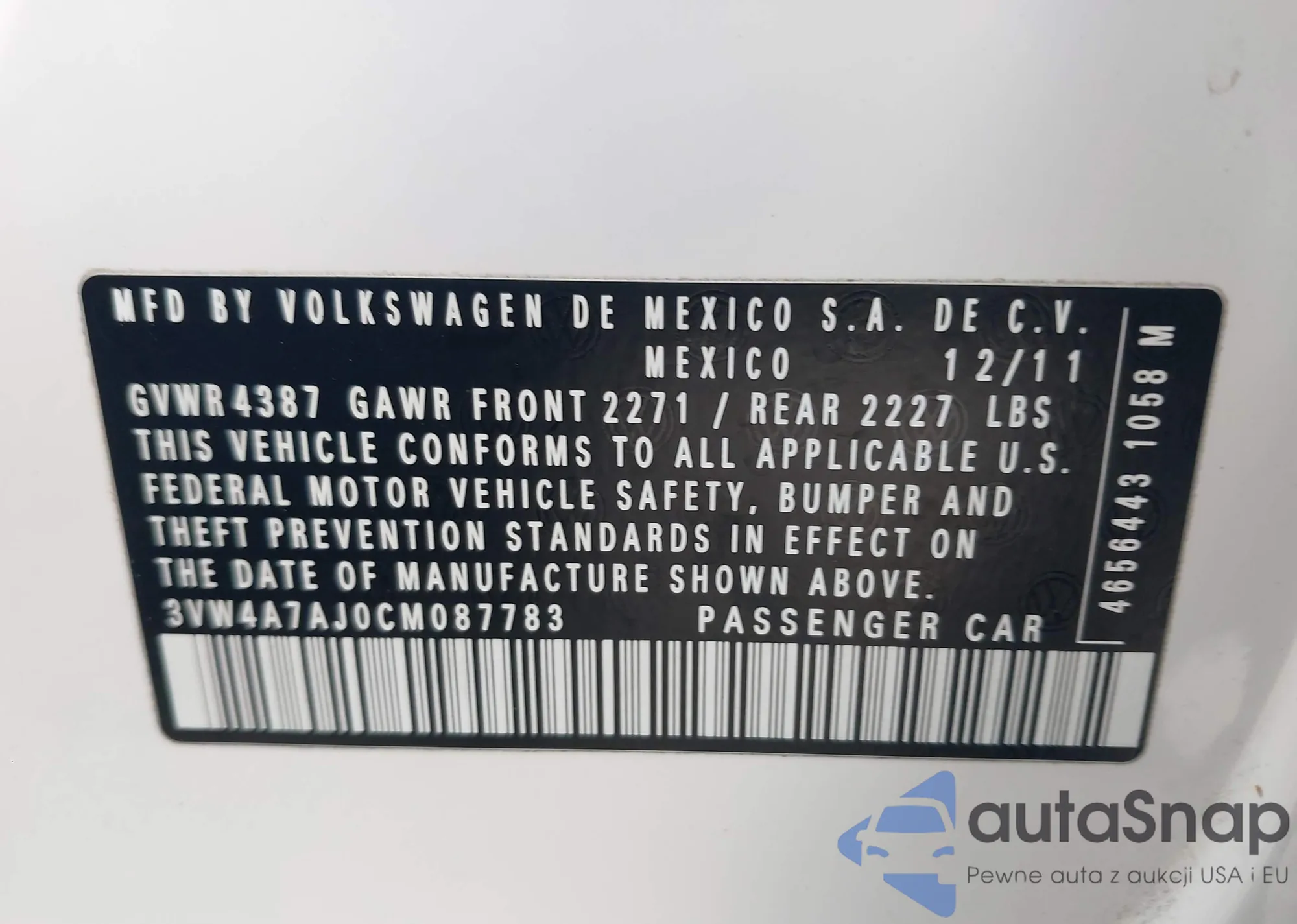 LOT: 43756206 VIN: 3VW4A7AJ0CM087783