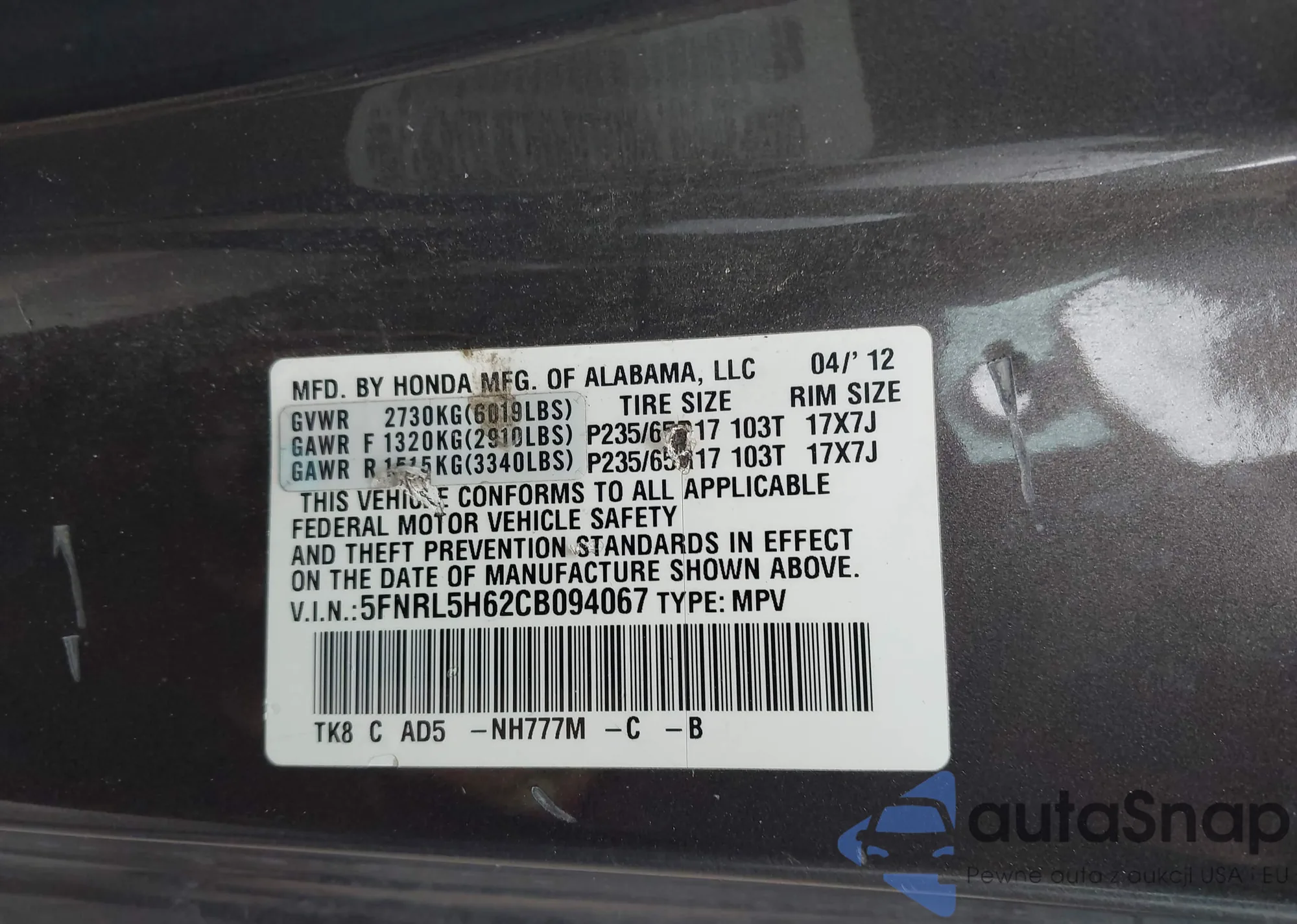 • VIN 5J6RM4H95GL087385