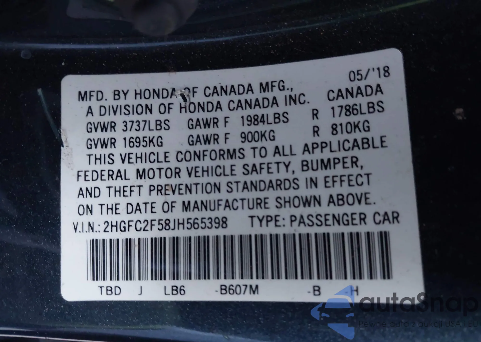 • VIN 2HGFC2F58JH565398
