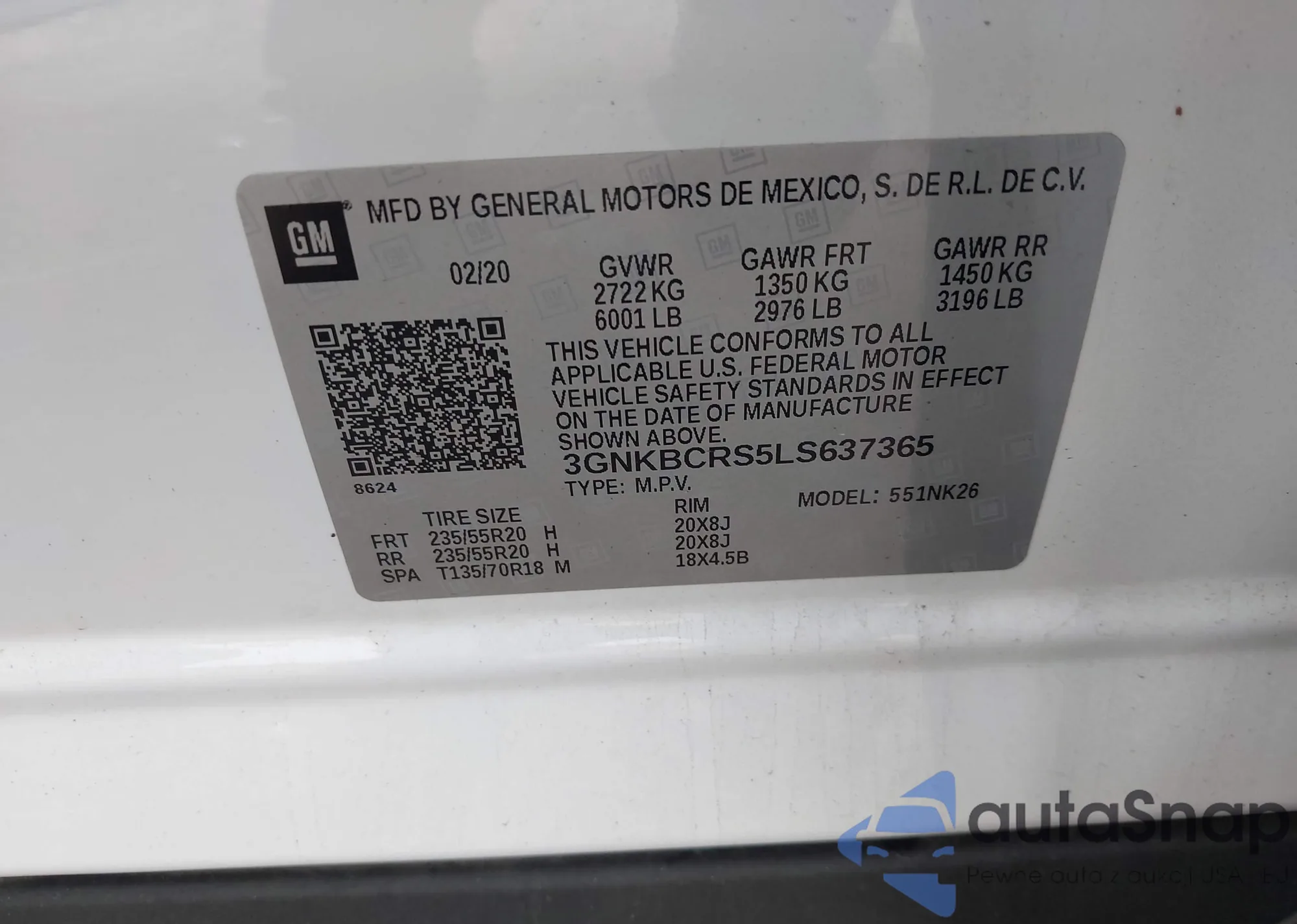 LOT: 43533223 VIN: 3GNKBCRS5LS637365