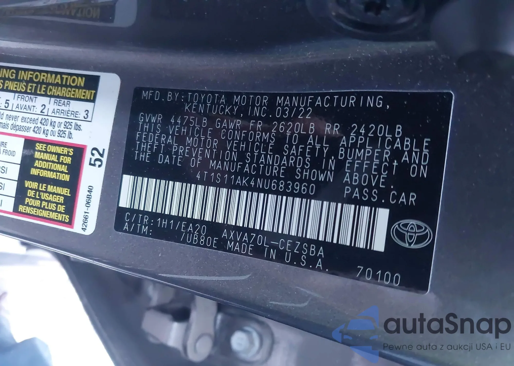2022 Toyota Camry Se from USA, damaged, VIN 4T1S11AK4NU683960