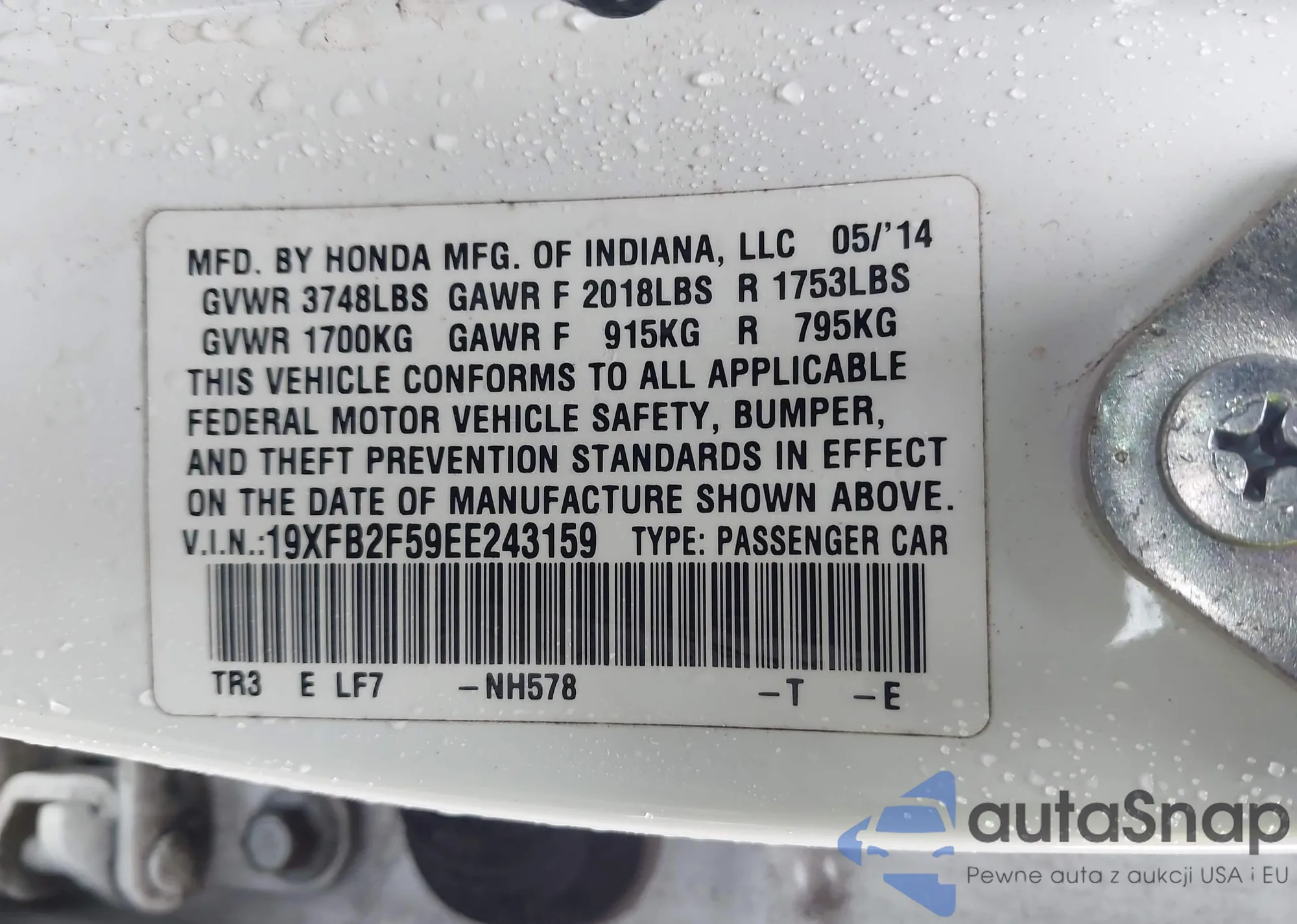 LOT: 43909578 VIN: 19XFB2F59EE243159