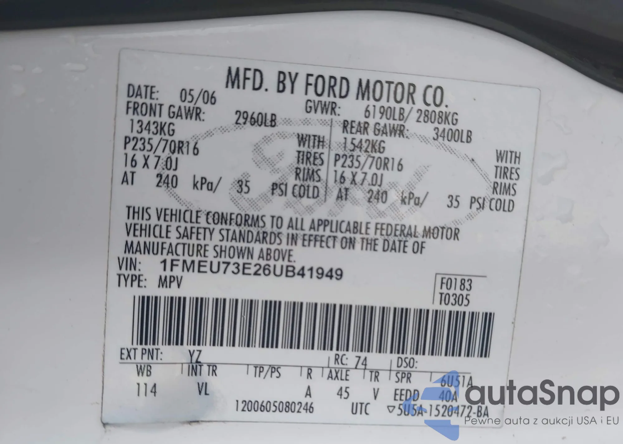 LOT: 43922996 VIN: 1FTYR14U17PA30203