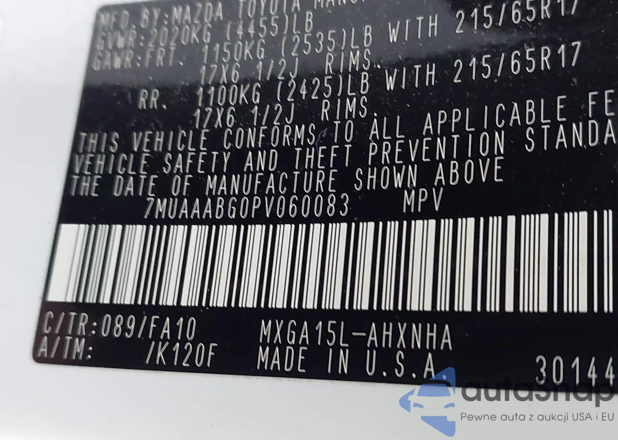 • VIN JA4AR3AUXKU030609