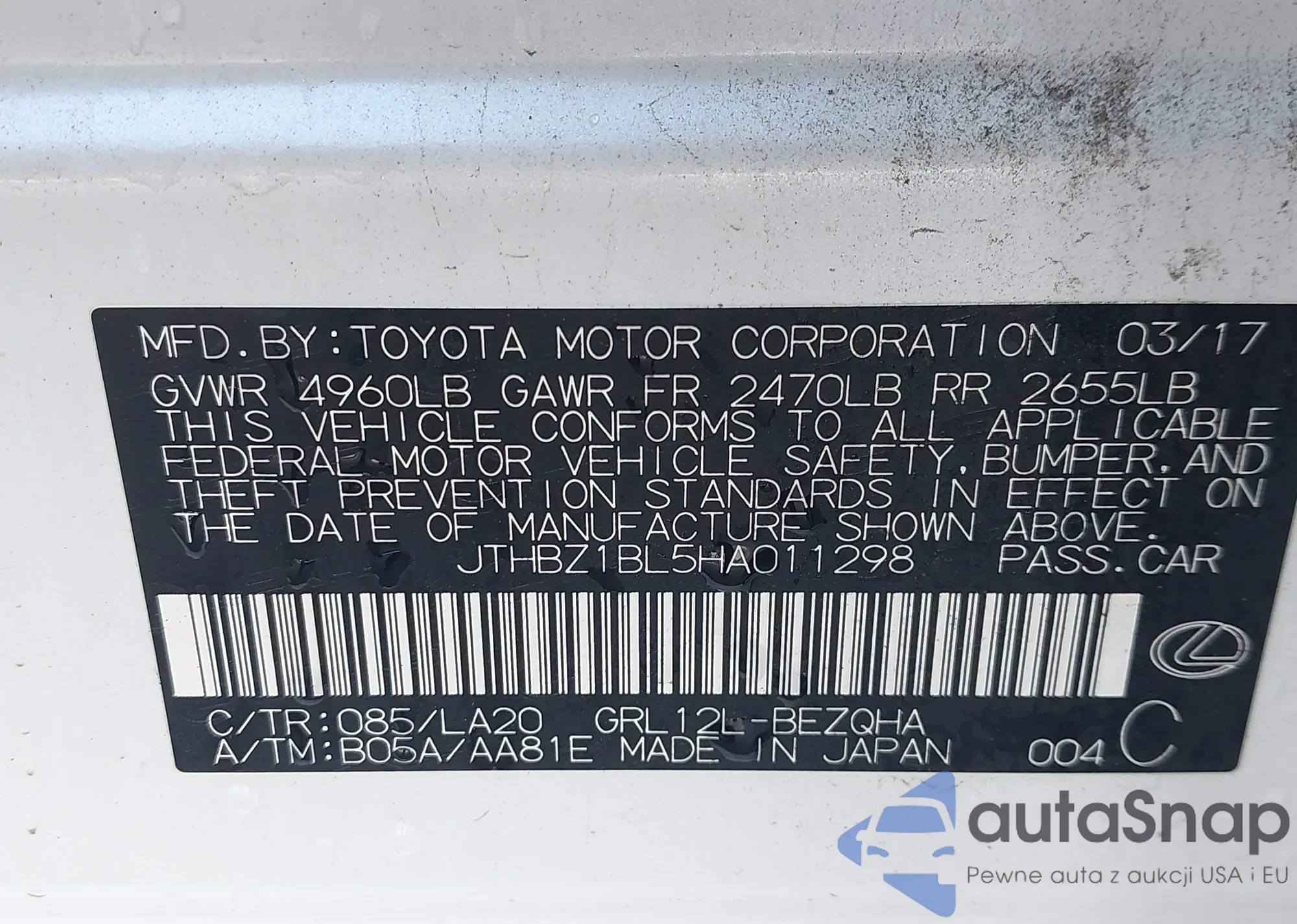 • VIN JTHBZ1BL5HA011298