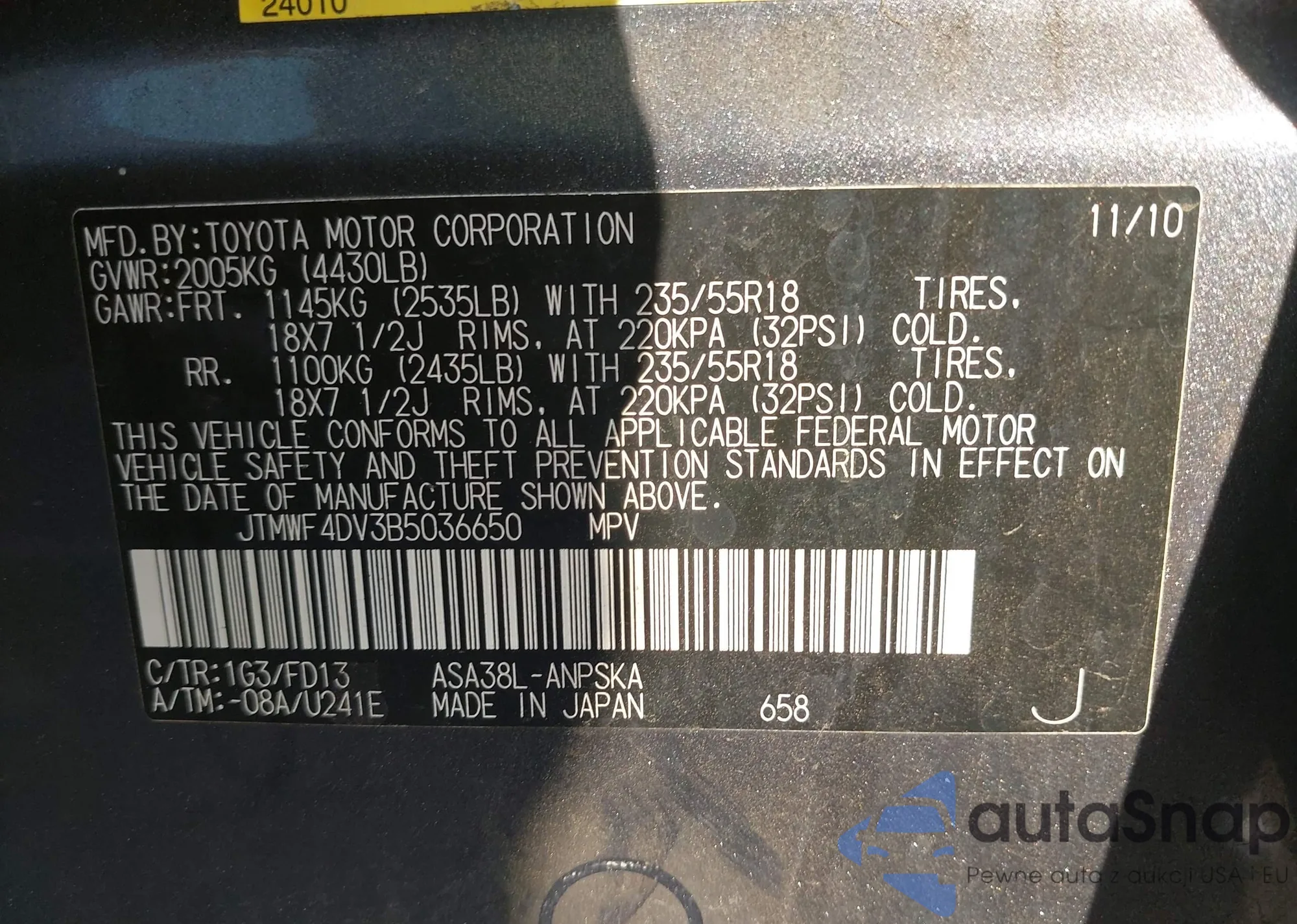 LOT: 43987731 VIN: JTMWF4DV3B5036650