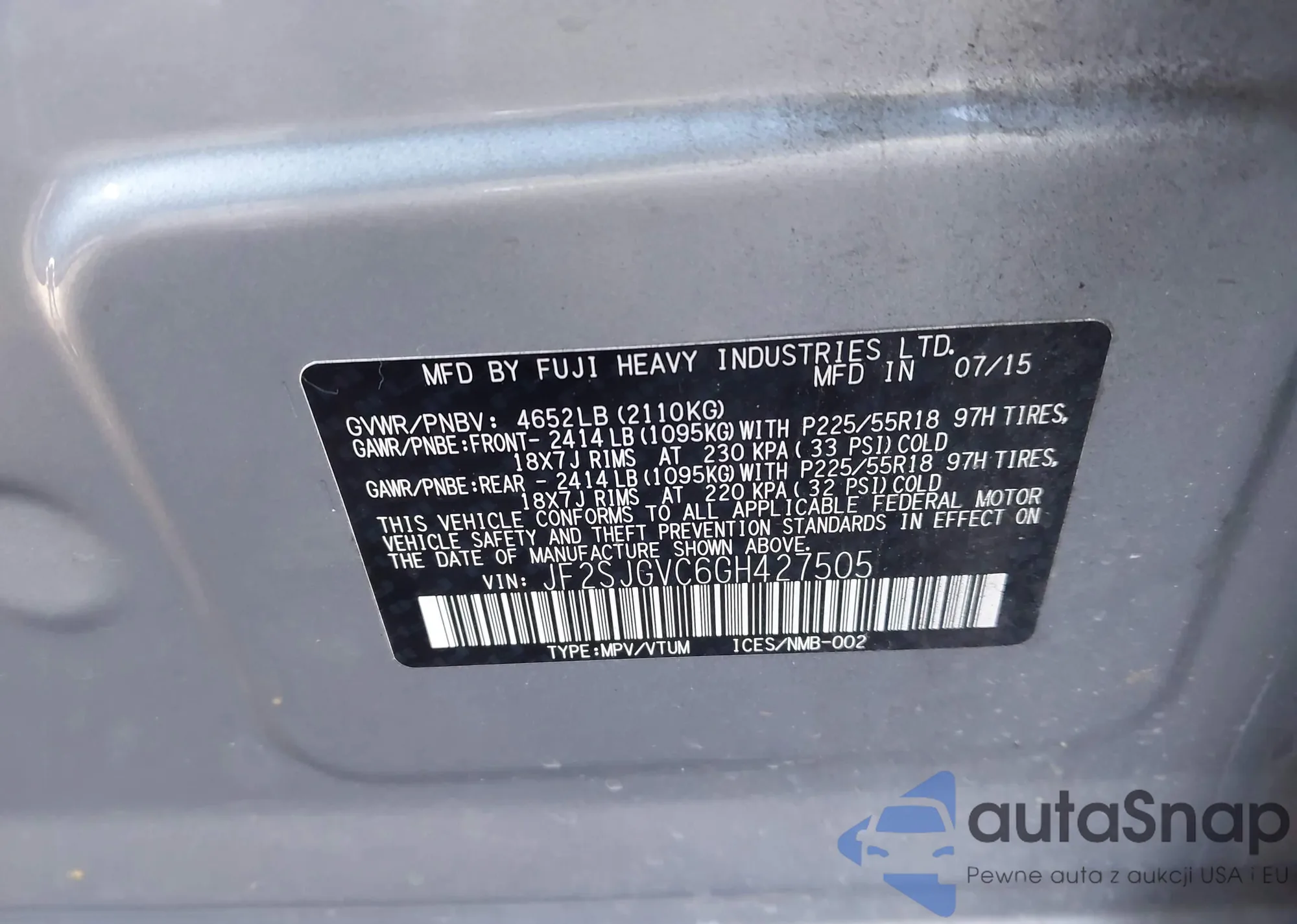 LOT: 44024393 VIN: JF2SJGVC6GH427505