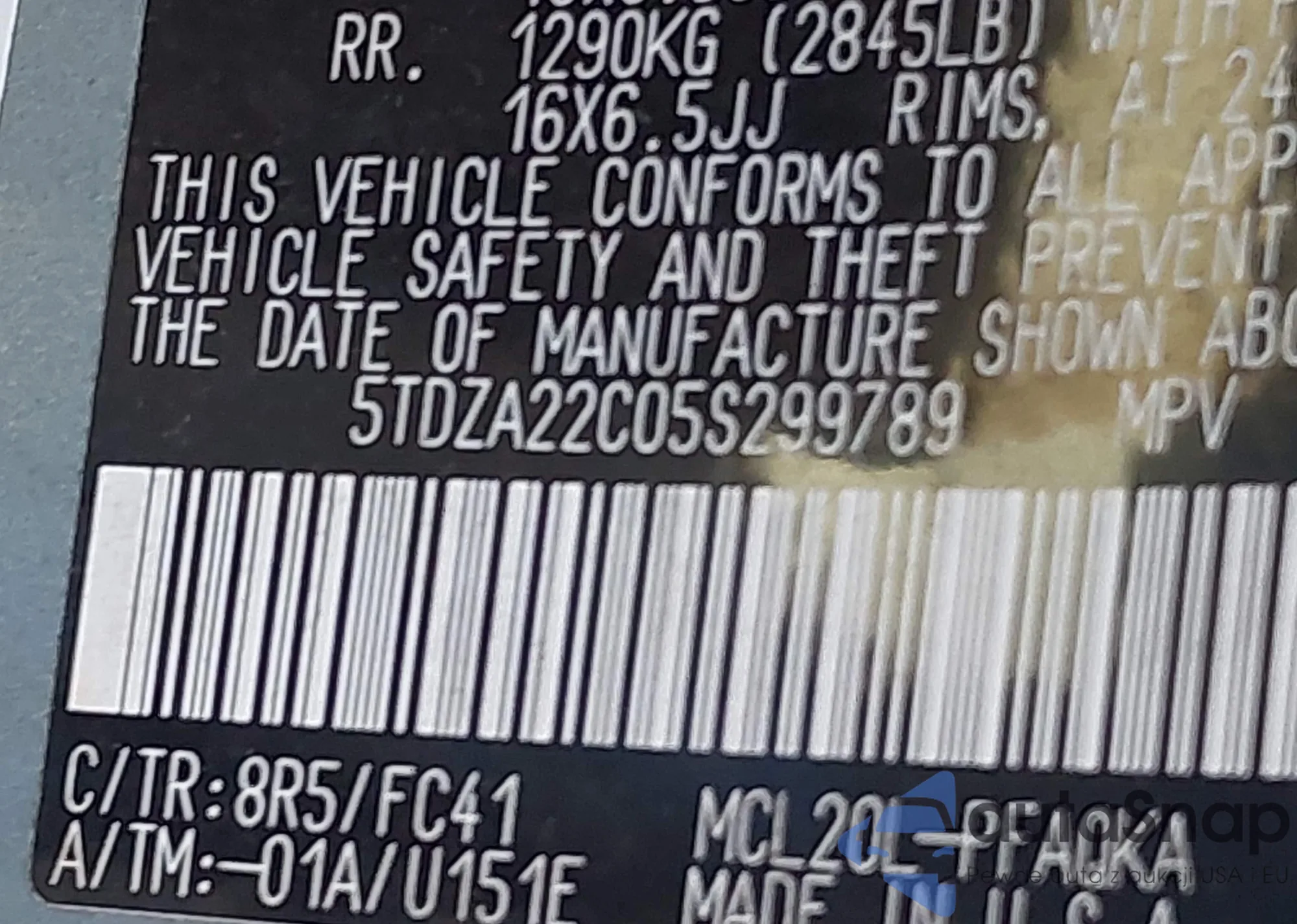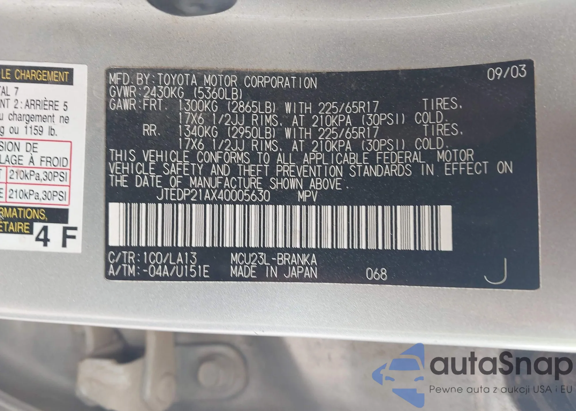 LOT: 43049277 VIN: JTEDP21AX40005630