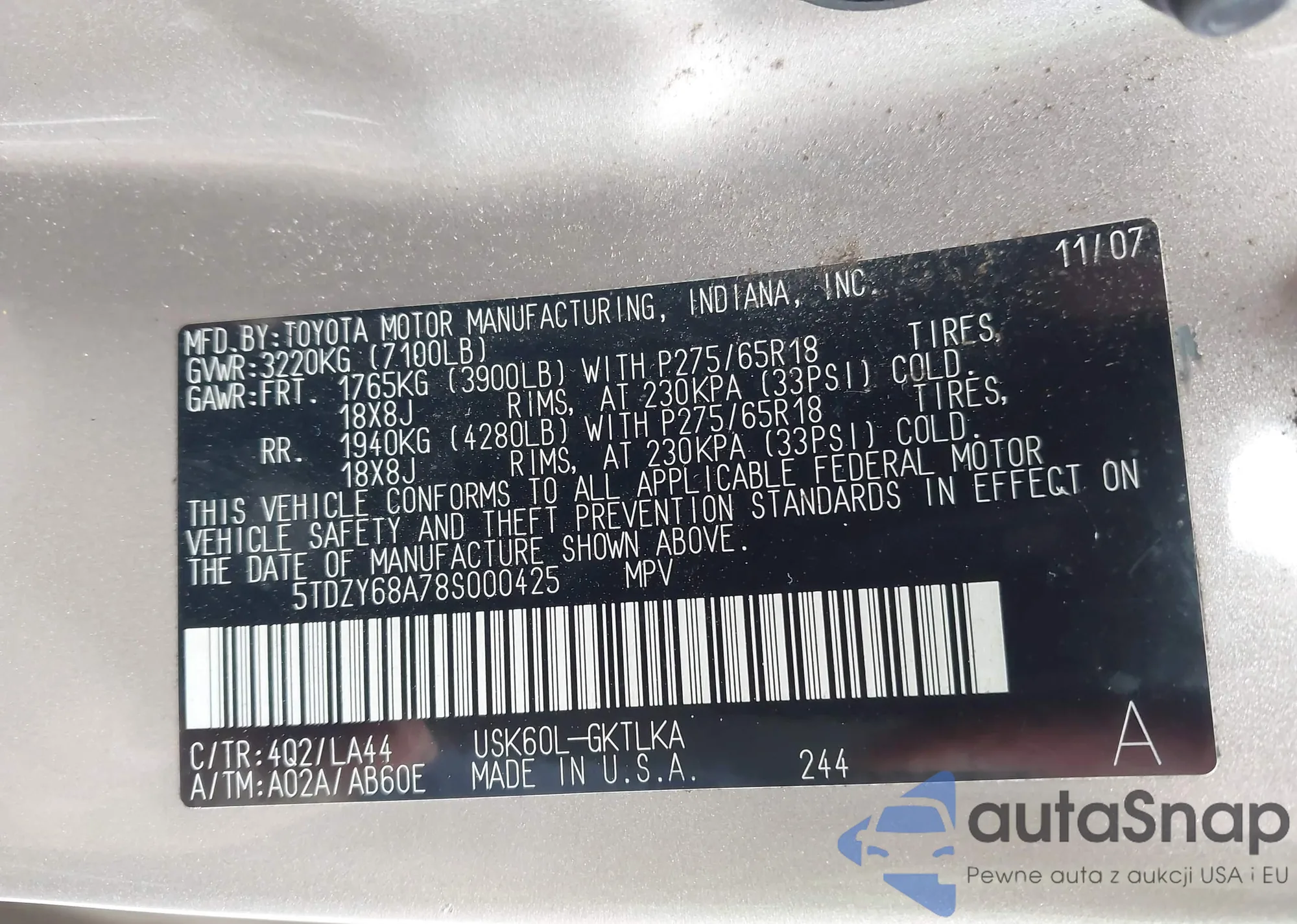 LOT: 43587658 VIN: 5TDZY68A78S000425