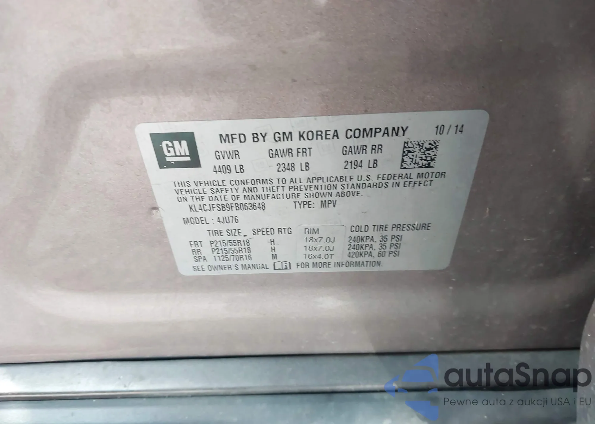 • VIN KL4CJFSB9FB063648