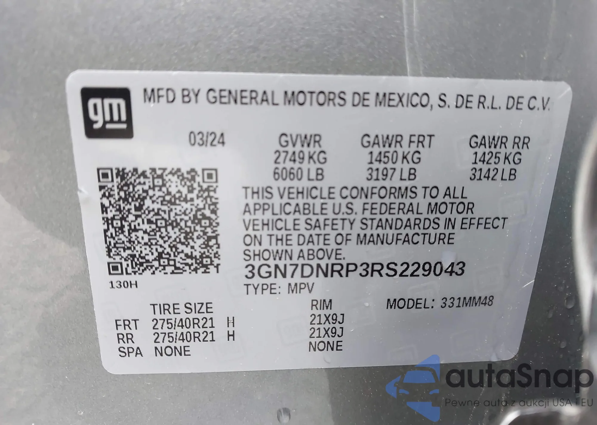 LOT: 43723339 VIN: 3GN7DNRP3RS229043