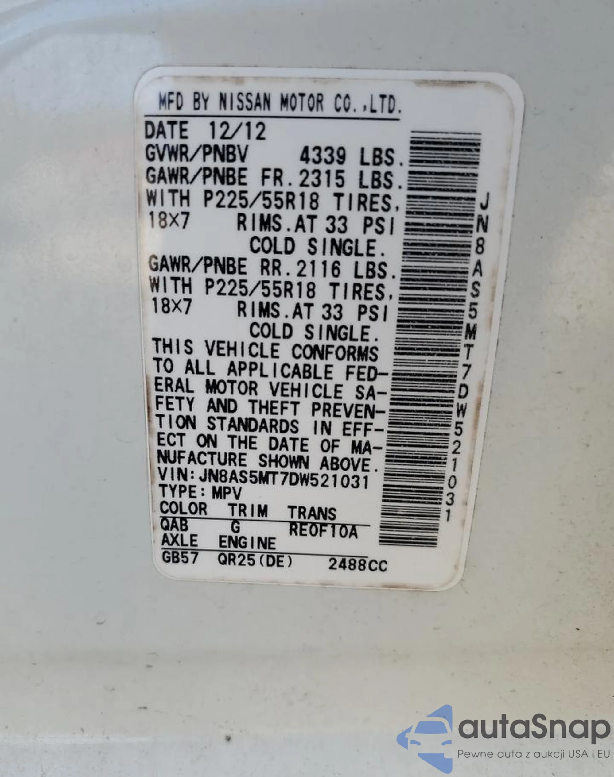 • VIN JN8AS5MT7DW521031