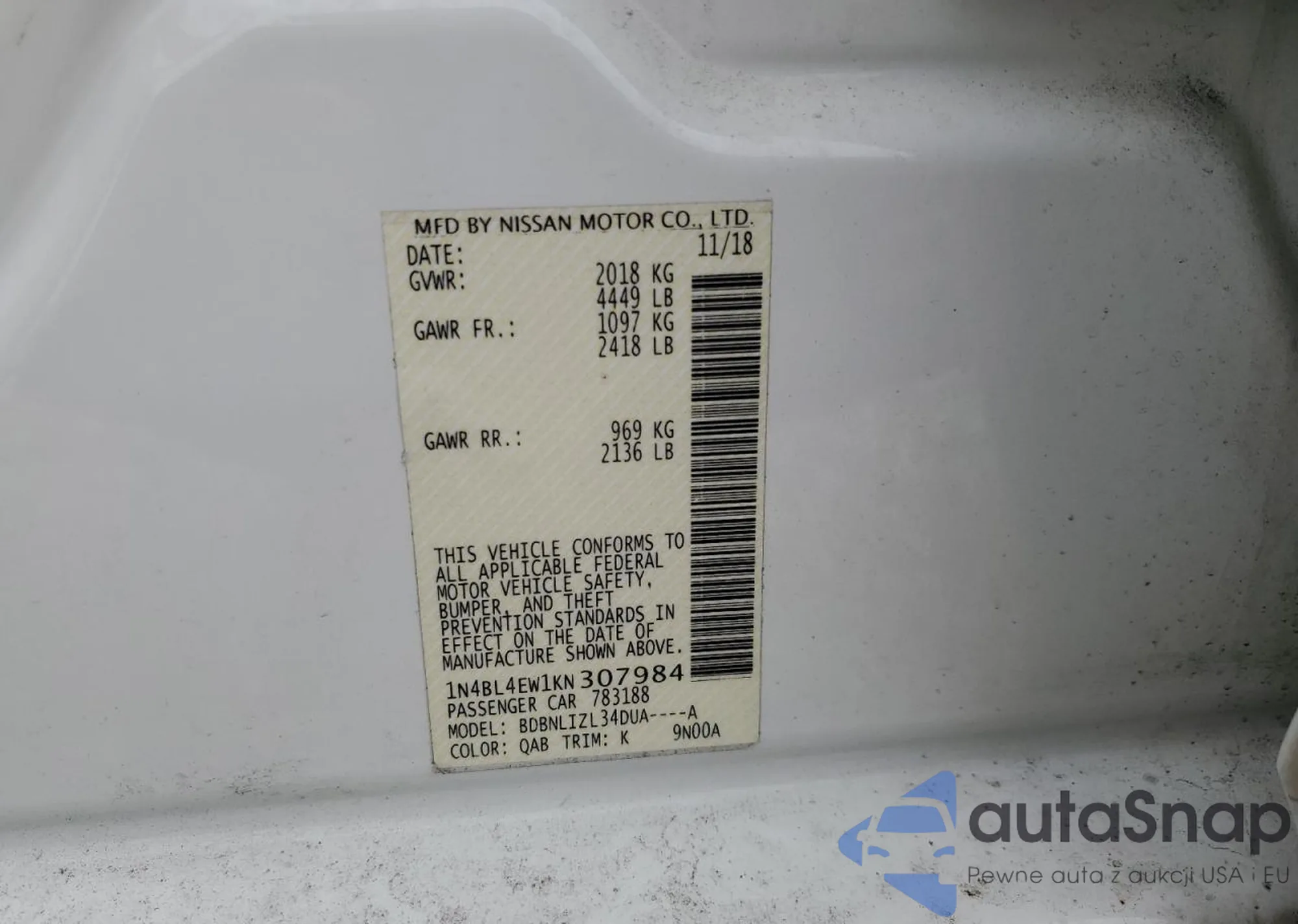 LOT: 93473405 VIN: 1N4BL4EW1KN307984