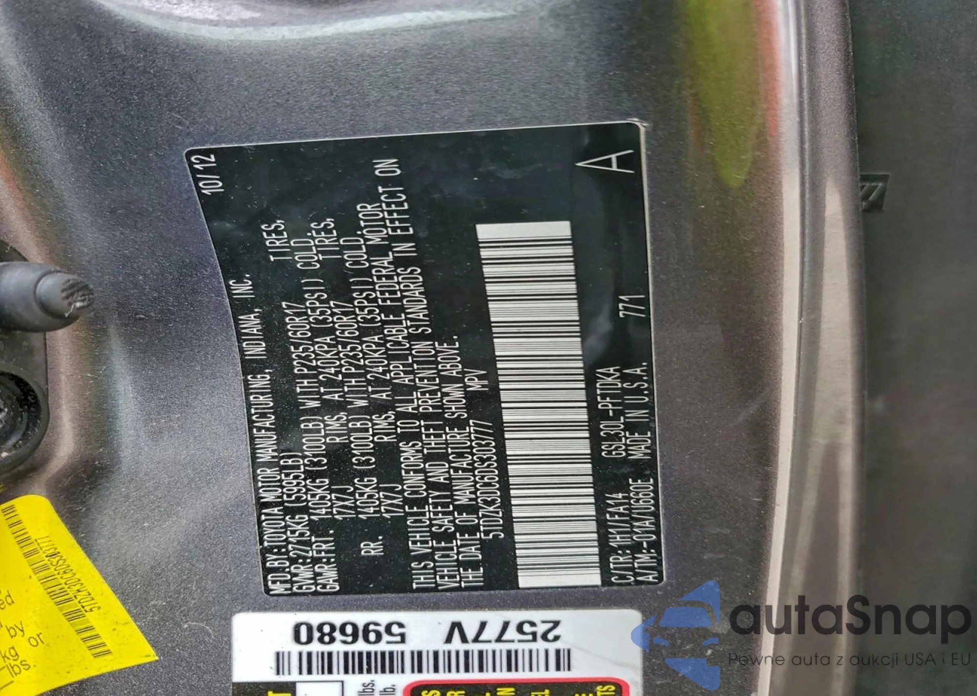 LOT: 95761665 VIN: 5TDZK3DC6DS303777