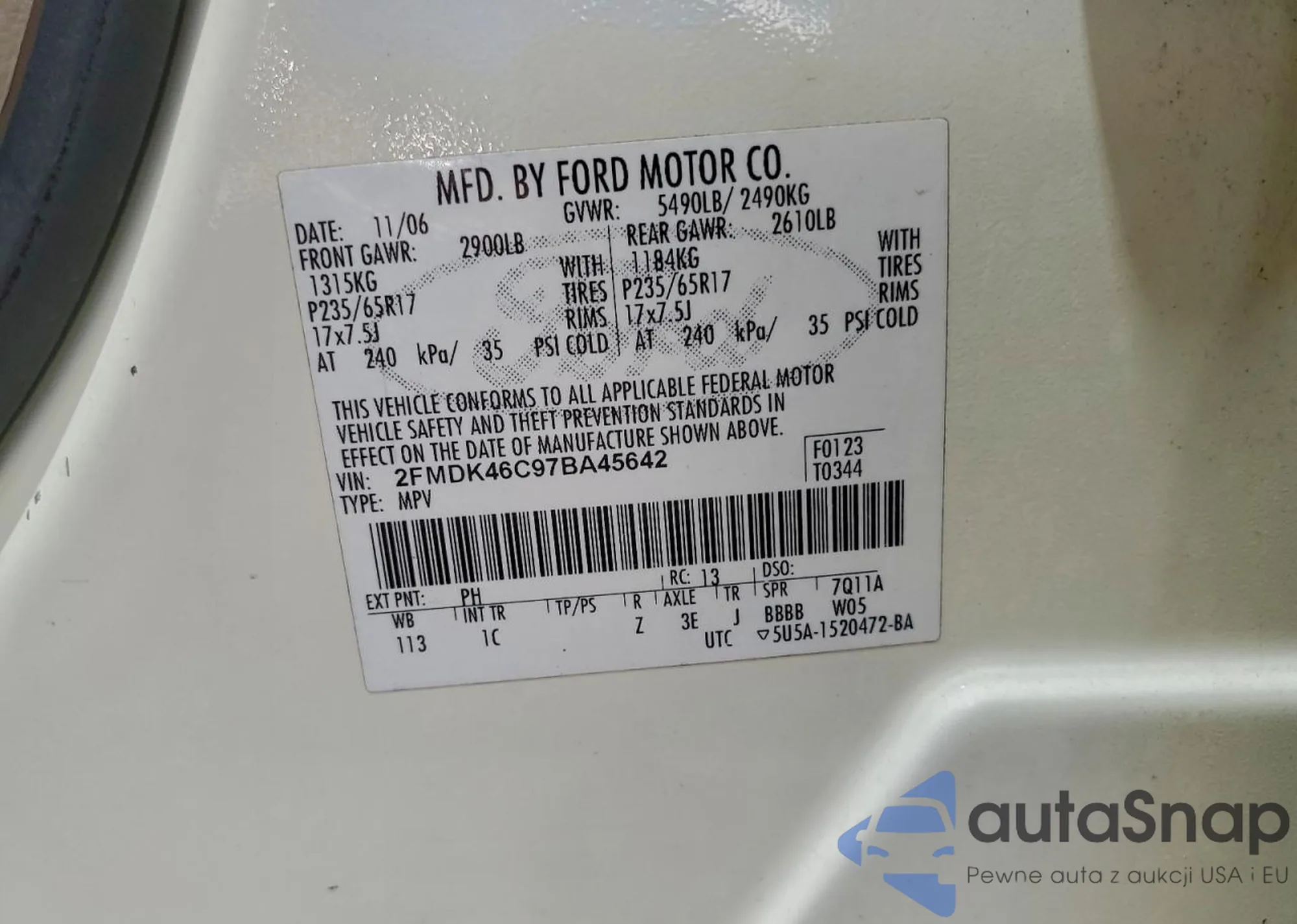 LOT: 97937385 VIN: 2FMDK46C97BA45642