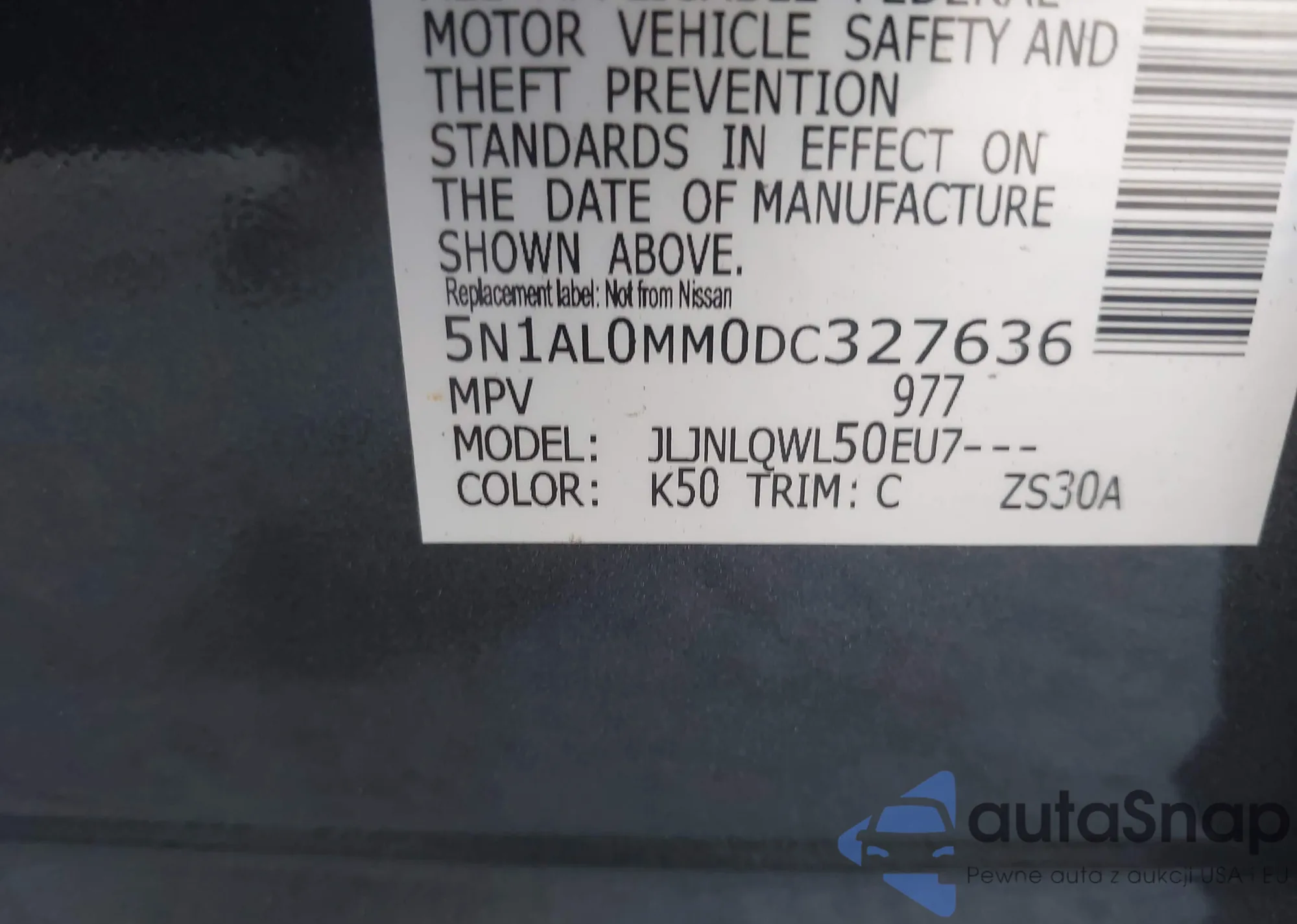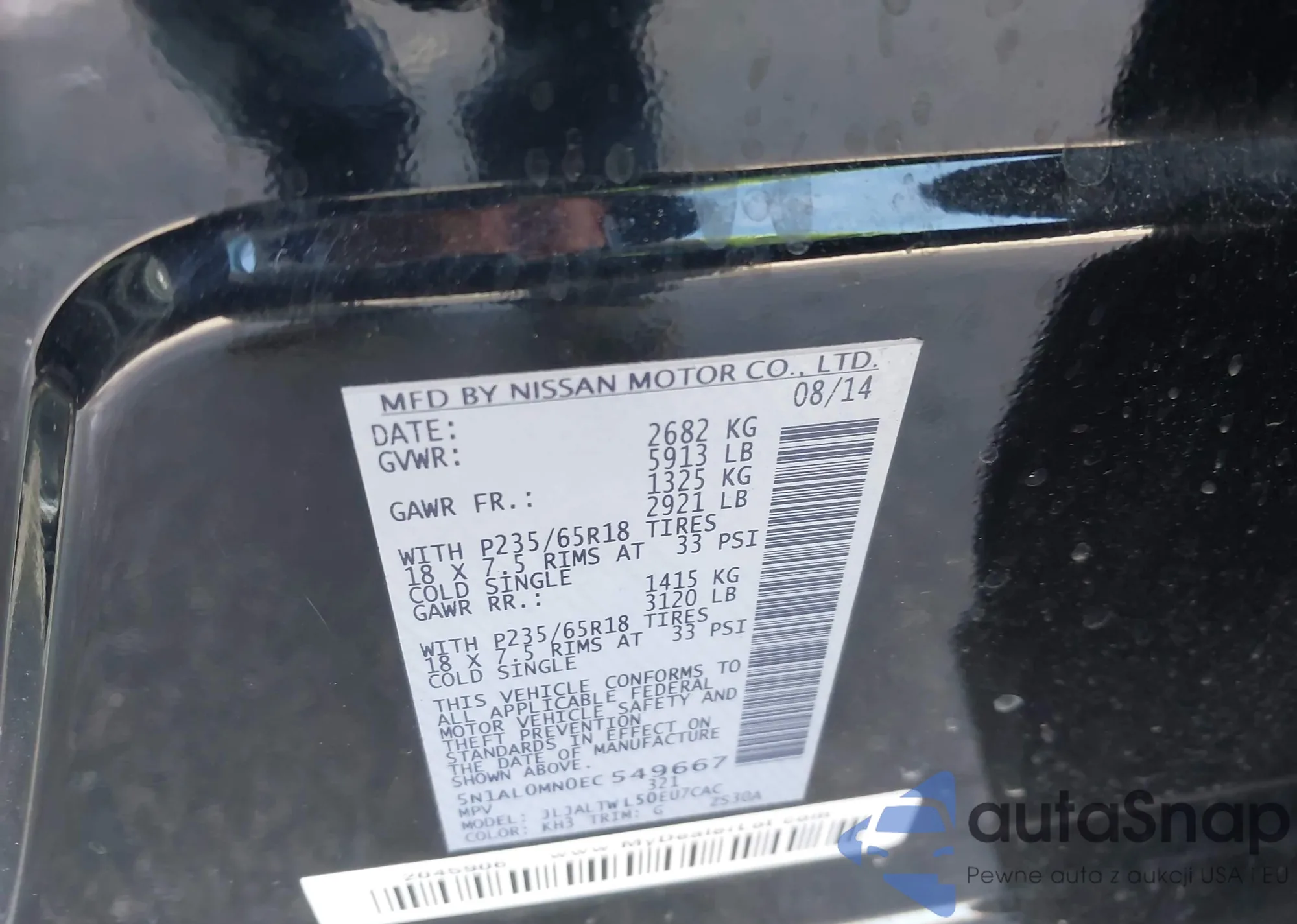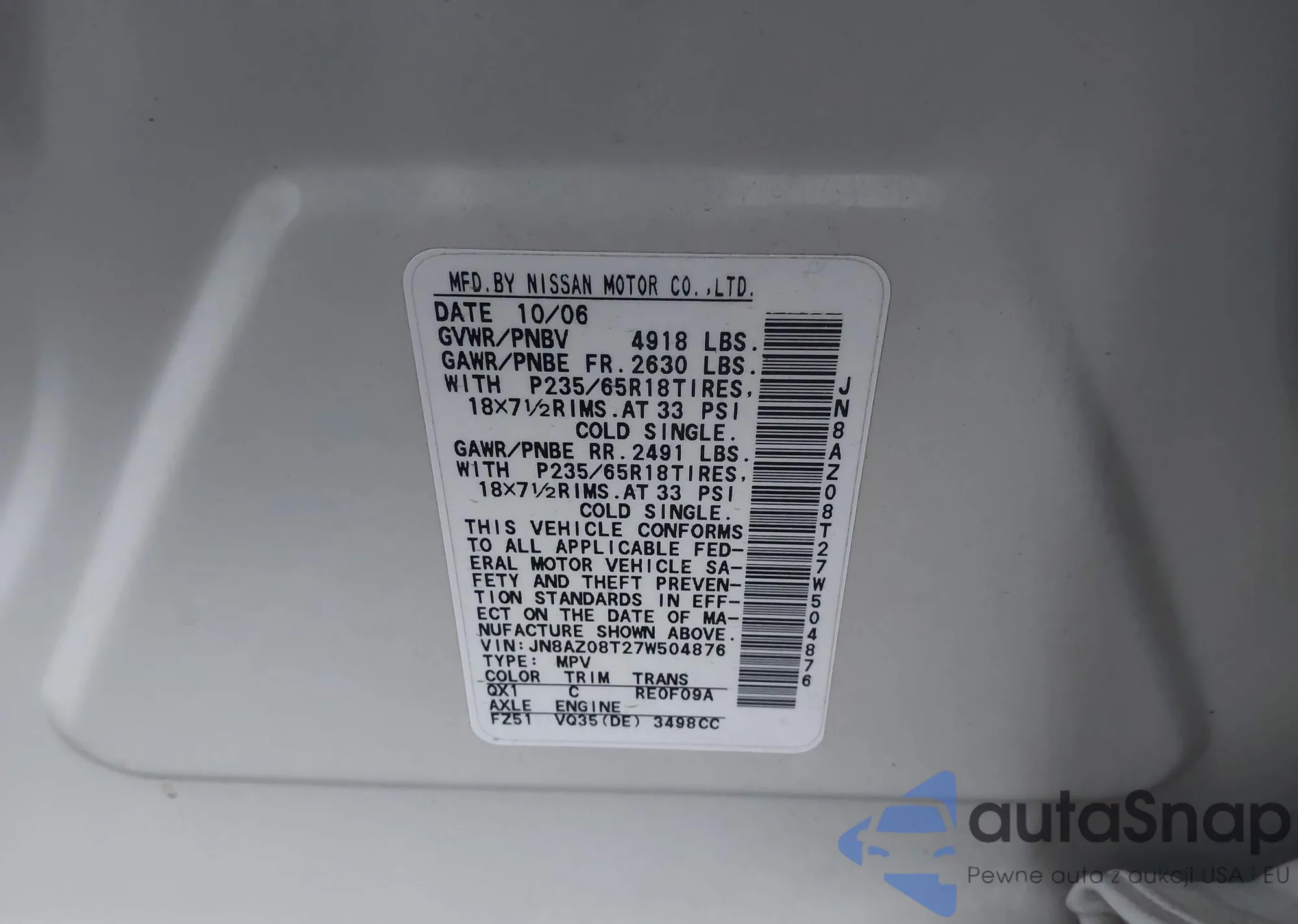 LOT: 43634452 VIN: JN8AZ08T27W504876