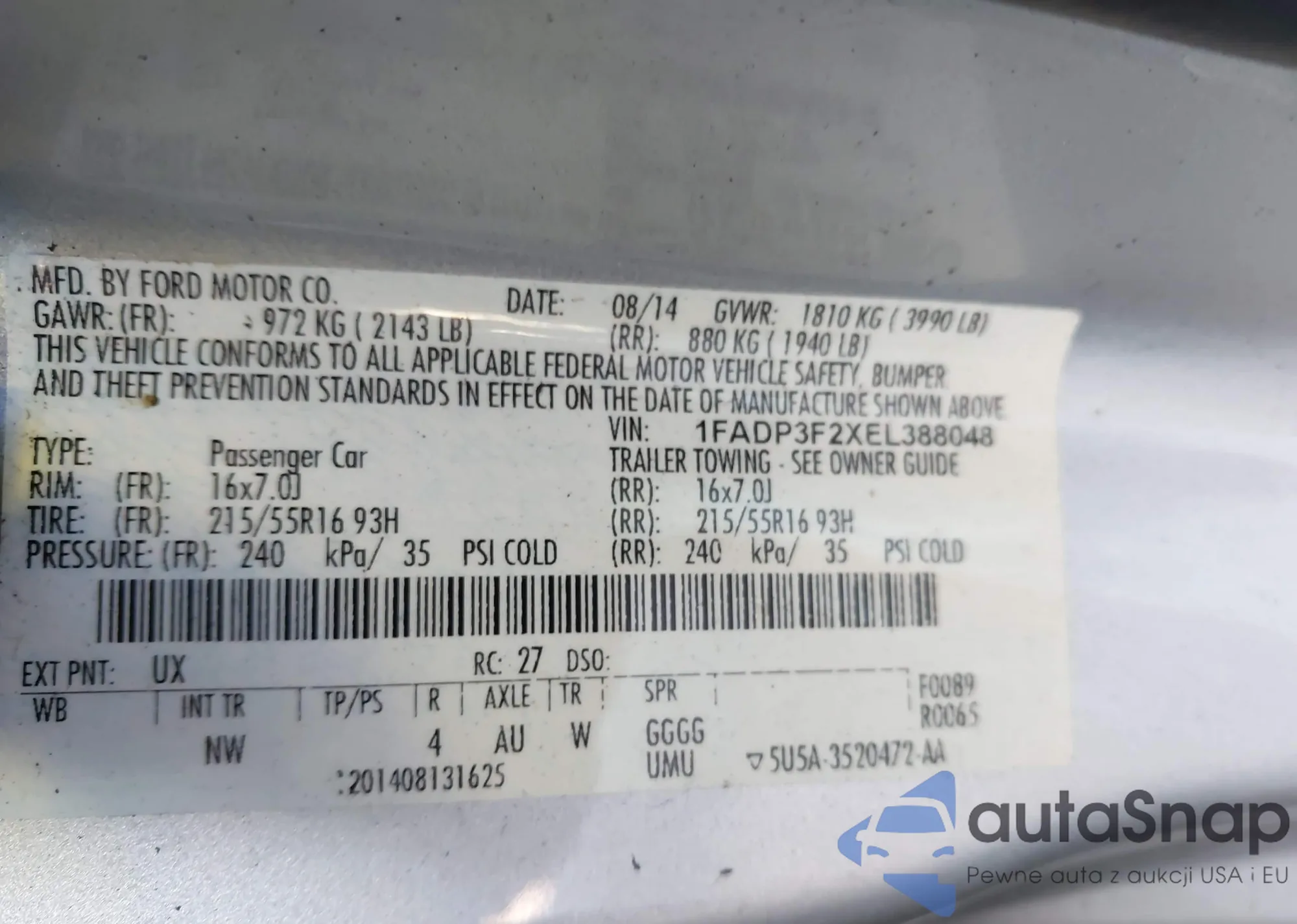 LOT: 43931682 VIN: 1FADP3F2XEL388048