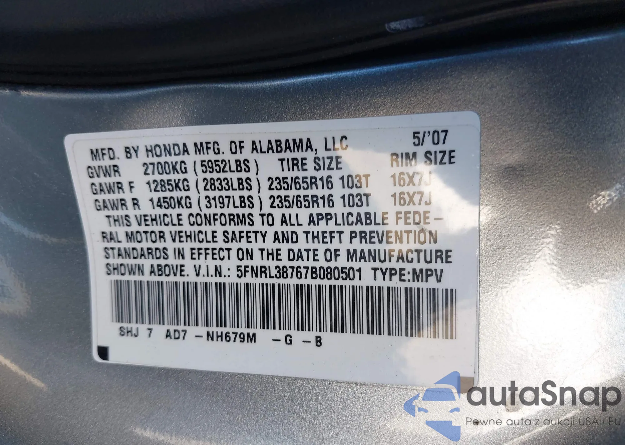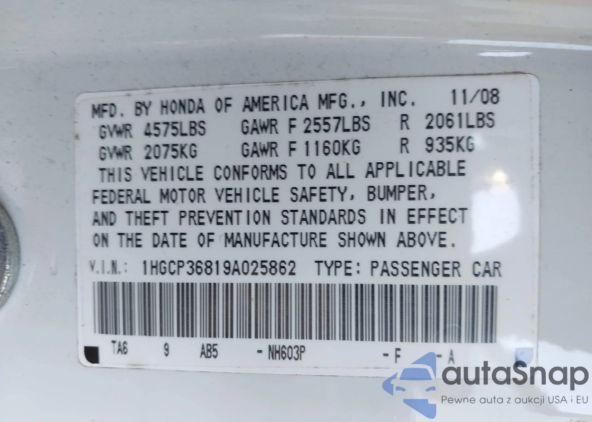 LOT: 43791251 VIN: 1HGCP36819A025862