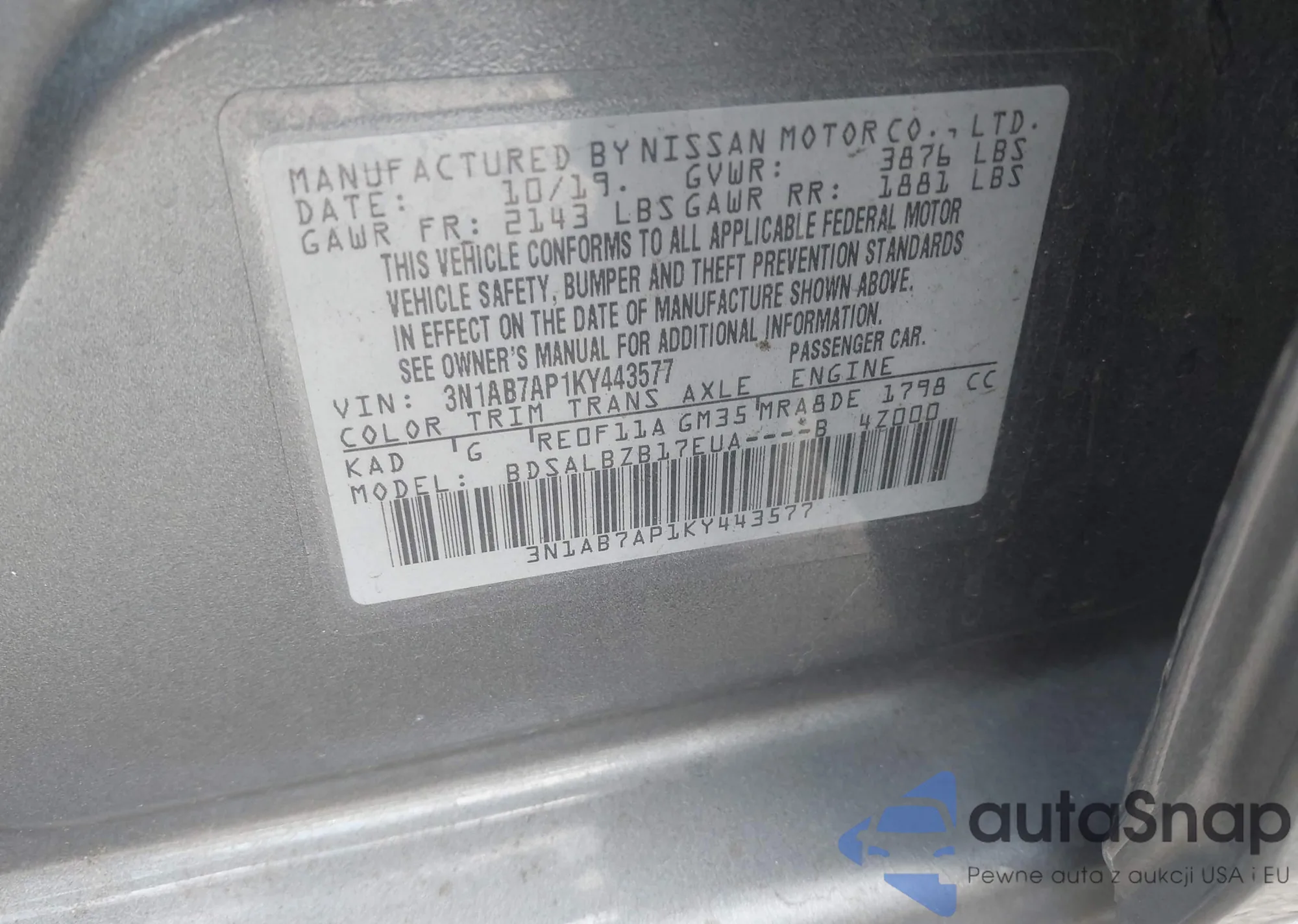 LOT: 43673468 VIN: 3N1AB7AP1KY443577