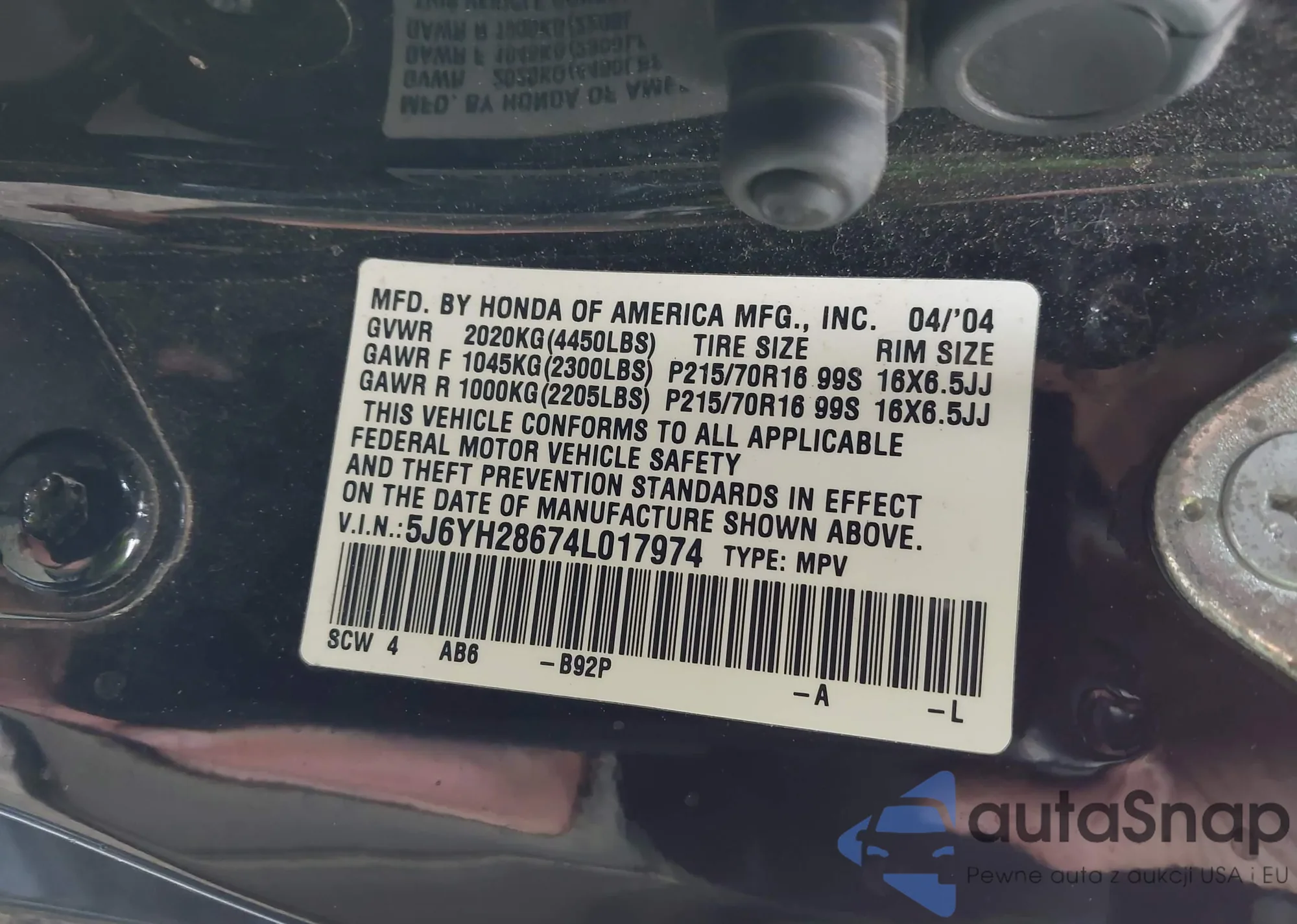LOT: 43732976 VIN: 5J6YH28674L017974