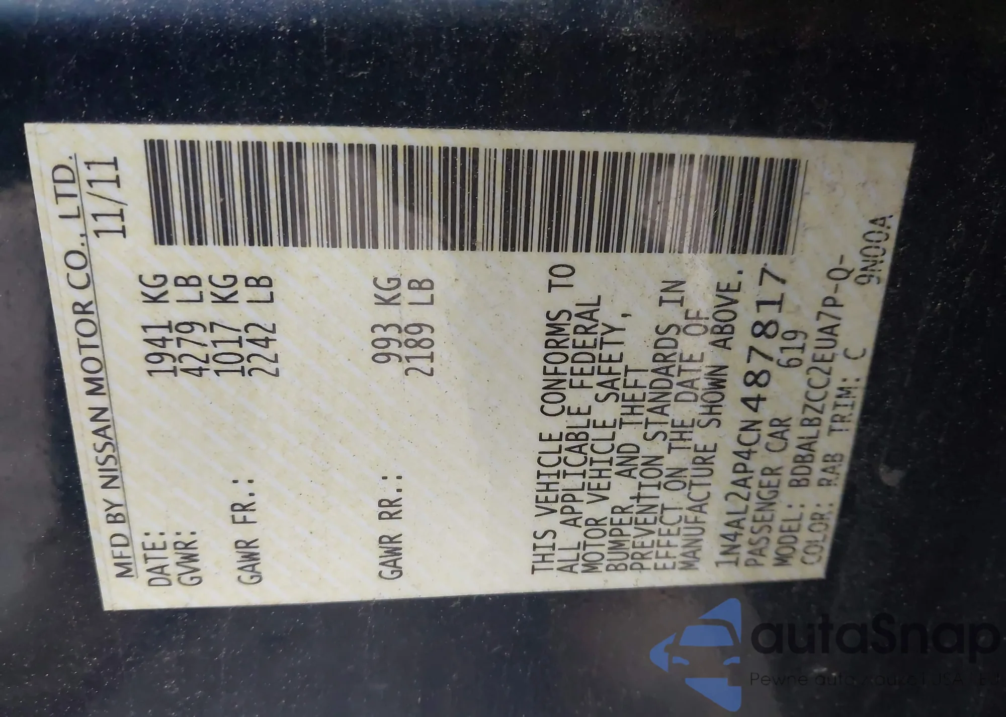 LOT: 43909100 VIN: 1N4AL2AP4CN487817