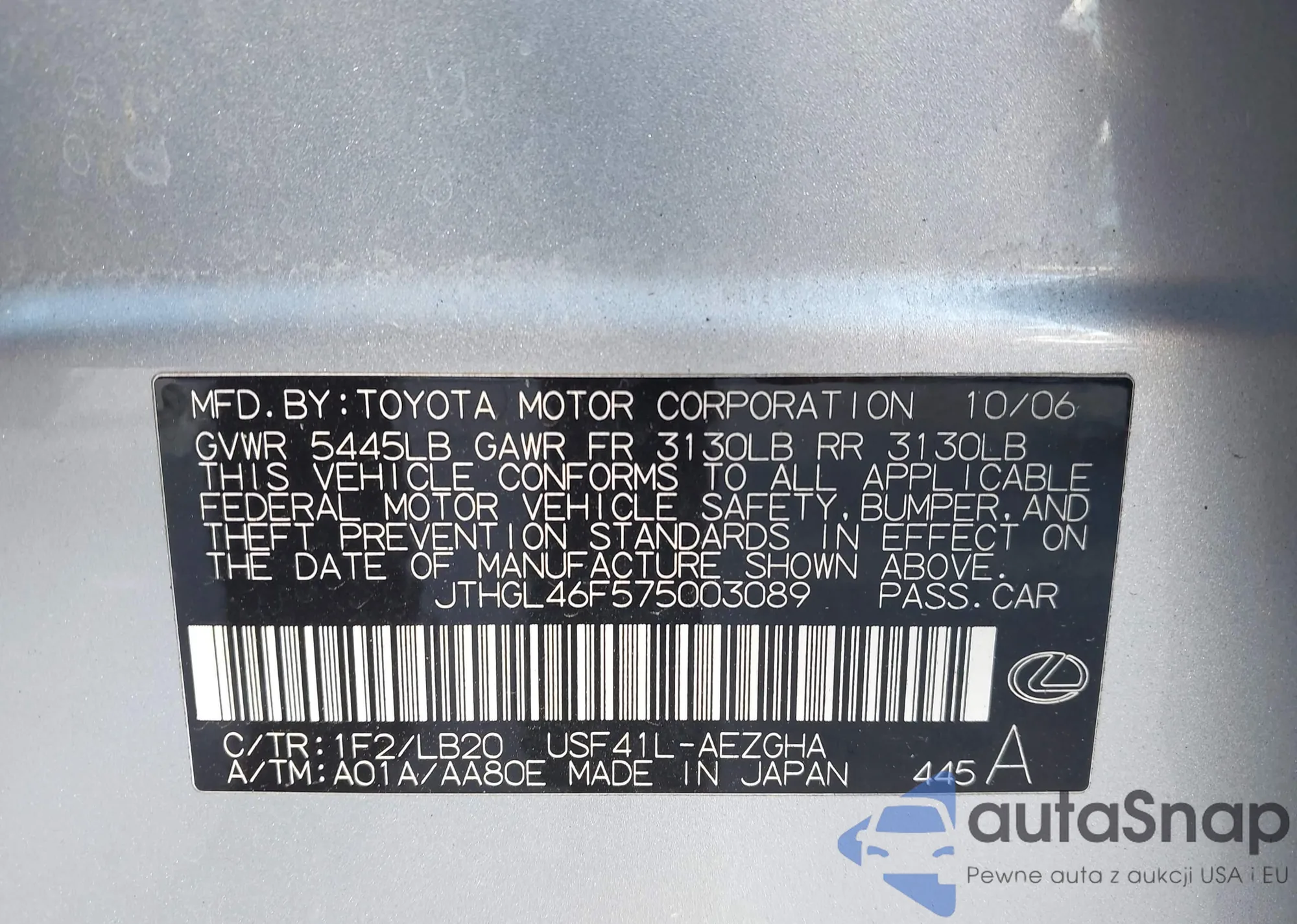 • VIN JTHGL46F575003089