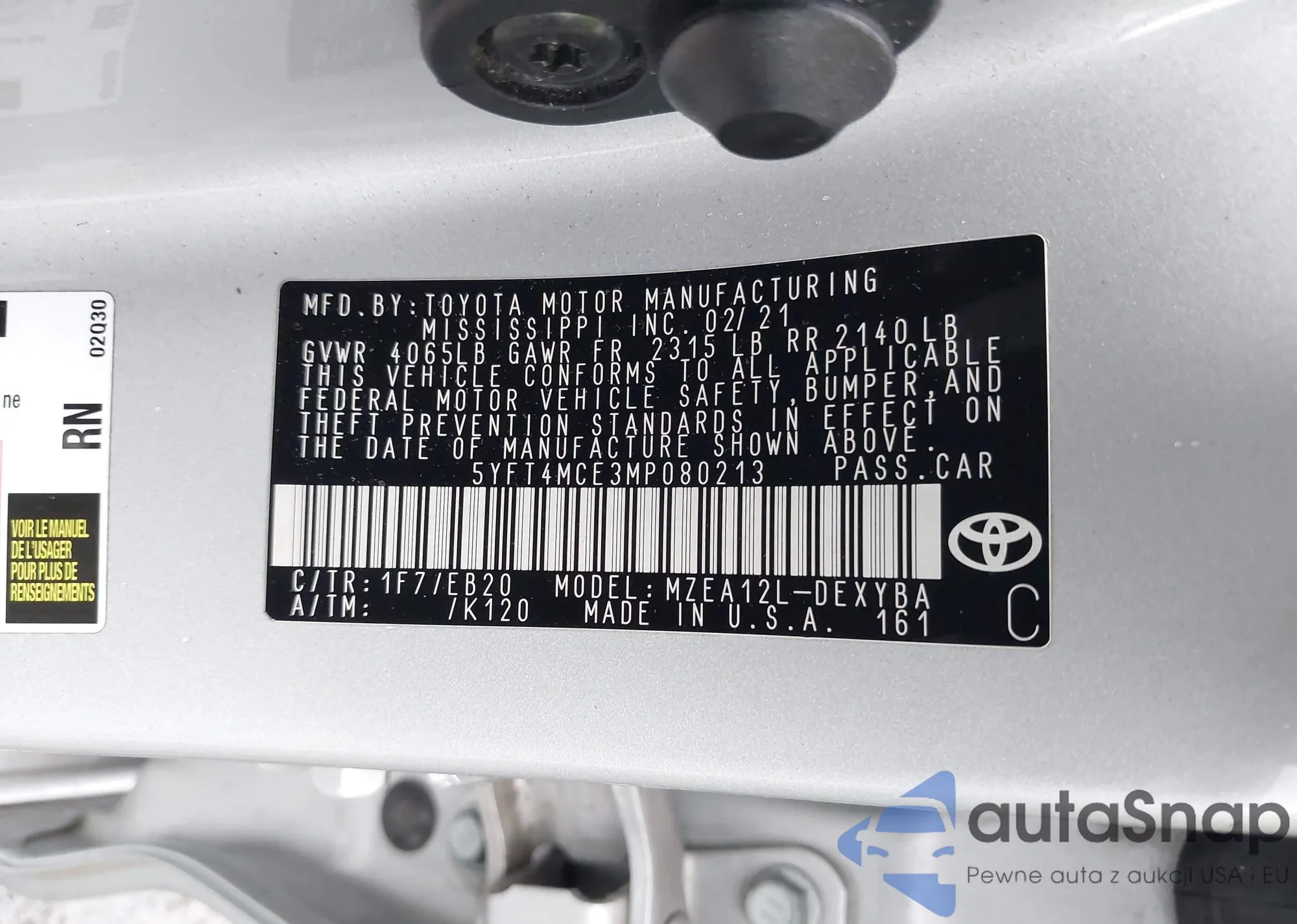 LOT: 43692713 VIN: 2T3H1RFV8MC134572