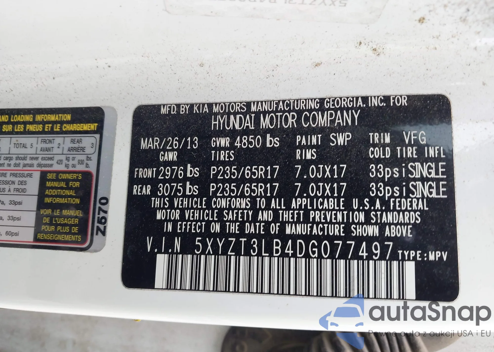 • VIN 5XYZT3LB4DG077497