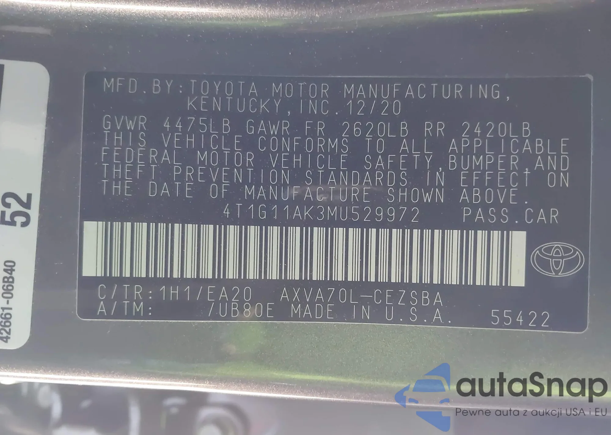 • VIN 4T1G11AK3MU529972