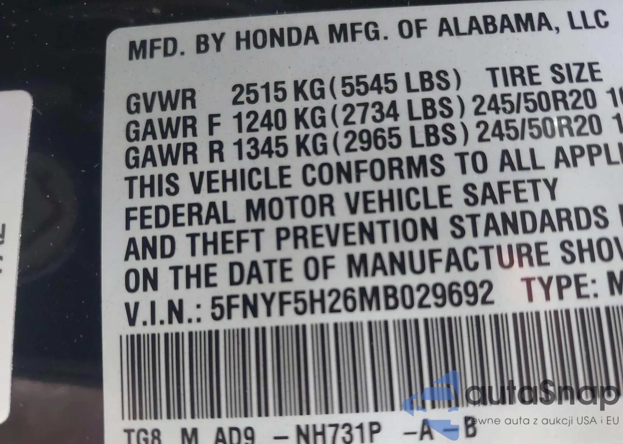 • VIN 2HKRW6H30HH218428