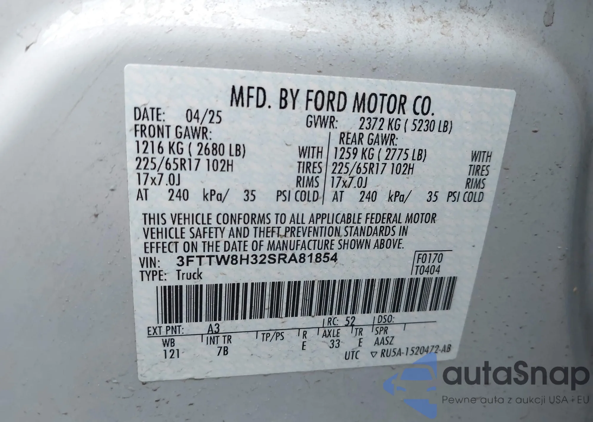 • VIN 3FTTW8H32SRA81854
