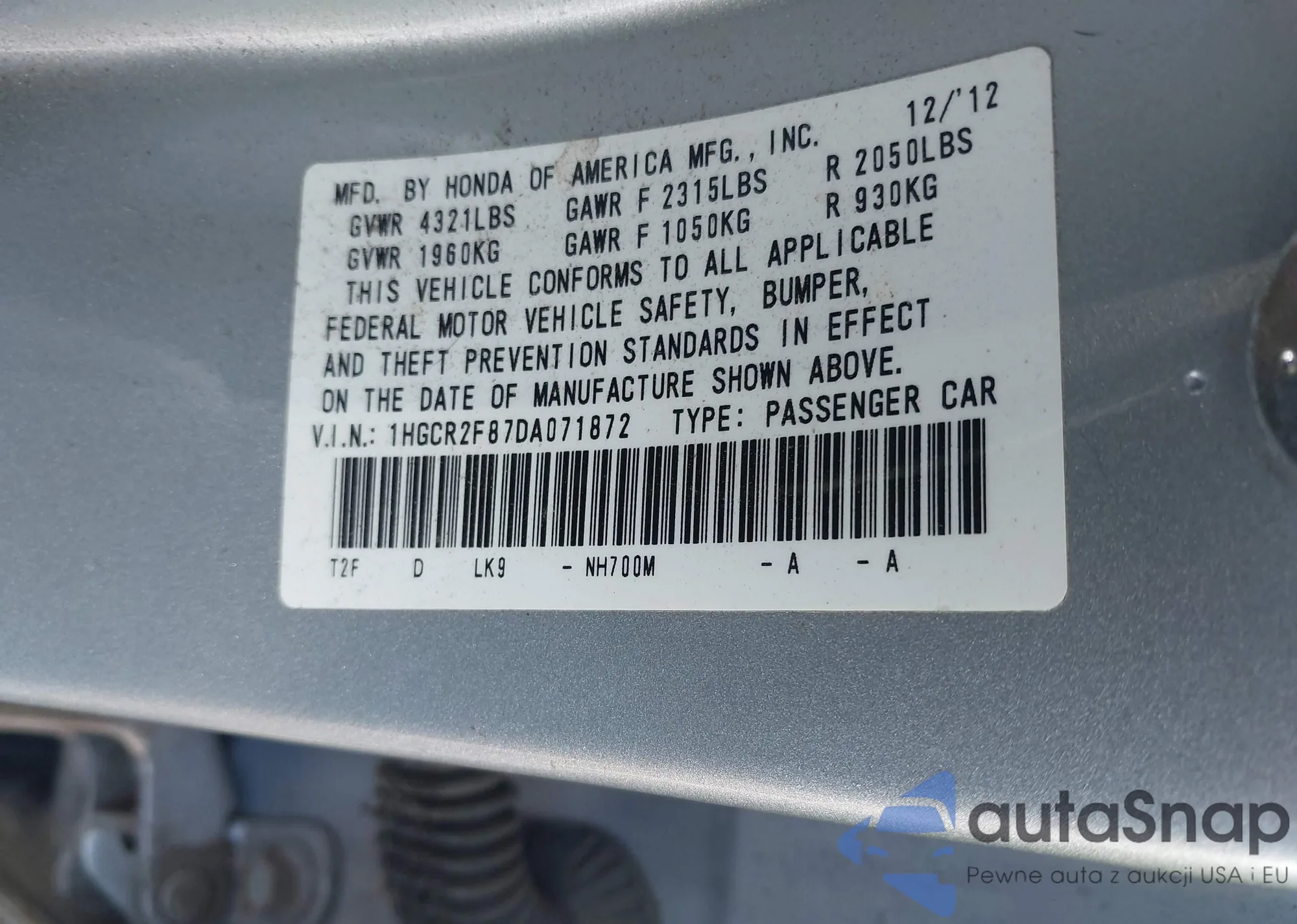 • VIN 1HGCR2F87DA071872
